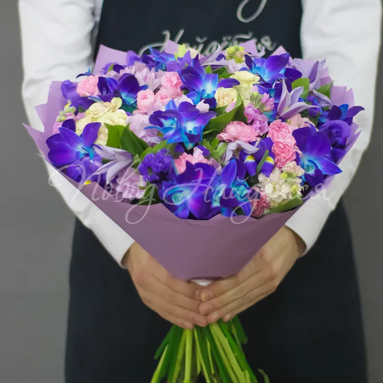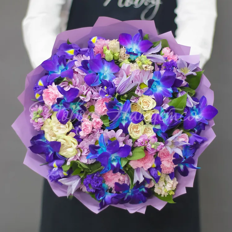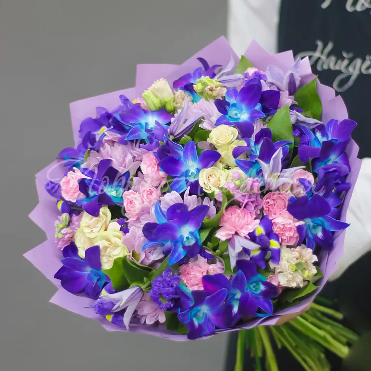 Состав: орхидея дендробиум синий 5шт, статица синяя 2шт, ирис 7шт, клематис 2шт , бакарди розовая 3шт, матиола розовая 2шт, эустома махровая алиса розовая 2шт , диантус розовый кустовой 4шт , роза кустовая яна 2шт, матиола крем 2шт , писташ.
