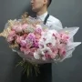 Состав: роза пионовидная мадам бомбастик 7шт, роза пионовидная пинк о хара 6шт, пион сара бернар 5шт, эустома алиса розовая 4шт, диантус розовый 6шт, гортензия розовая 2шт, озотамнус белый 3шт, роза кустовая розовая лидия 9шт, орхидея фаленопсис белая (7 бутонов) - 1шт (возможна замена по цвету), папротник золотой 2шт, рускус стабилизированный золотой 3шт, лист стрелиции белый 2шт, писташ 2/2.