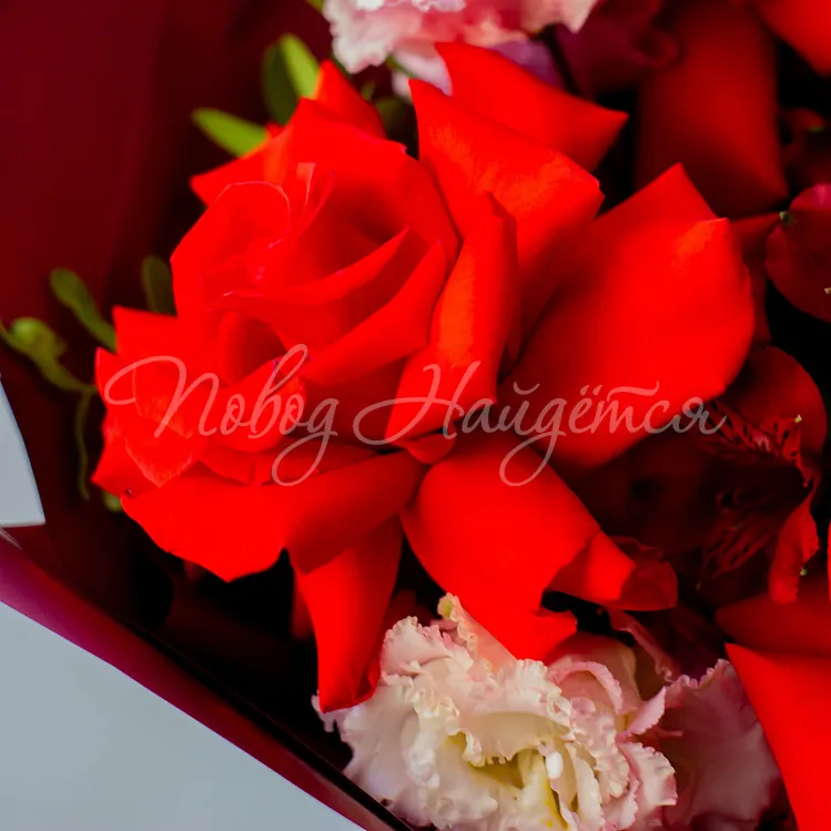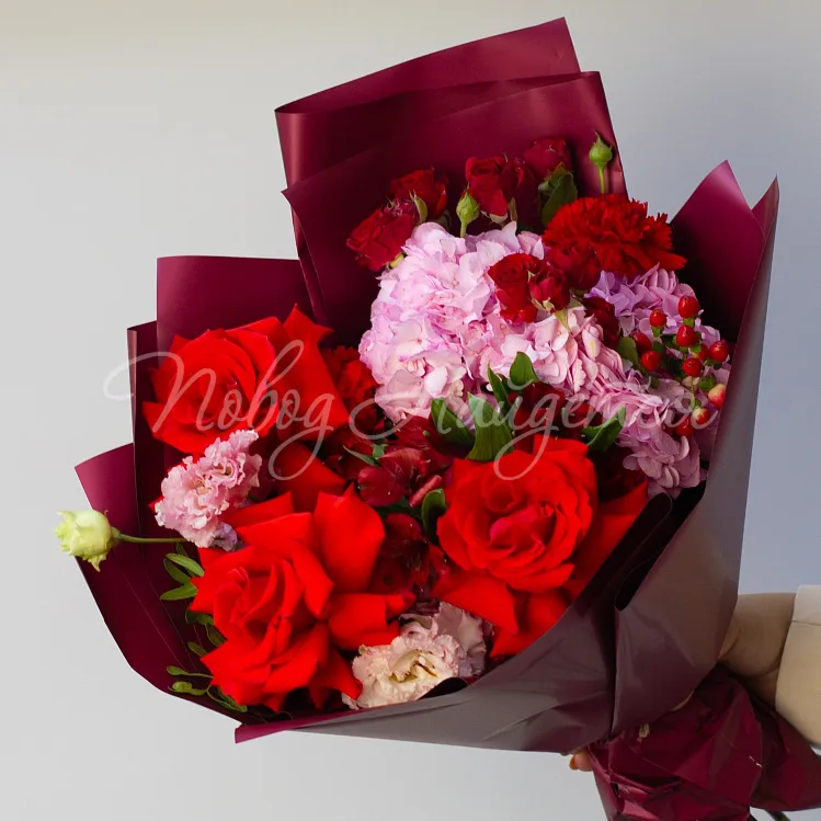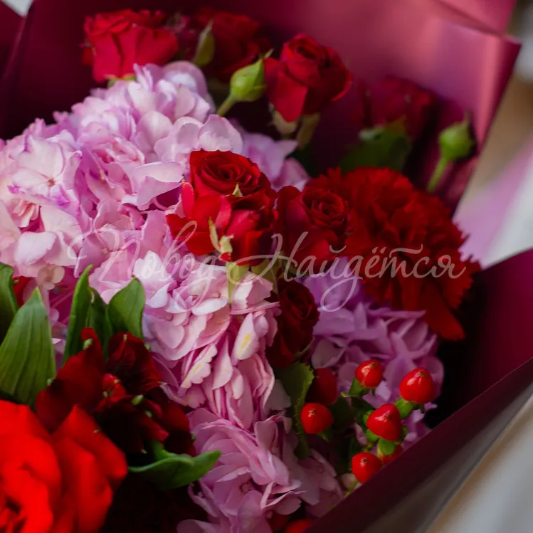 Состав: роза французская нина 3шт, гортензия розовая 1, альстромерия красная 2 шт, алиса розовая 2шт, гиперикум красный 1шт, роза красная кустовая 2шт, гвоздика красная 3шт, писташ.