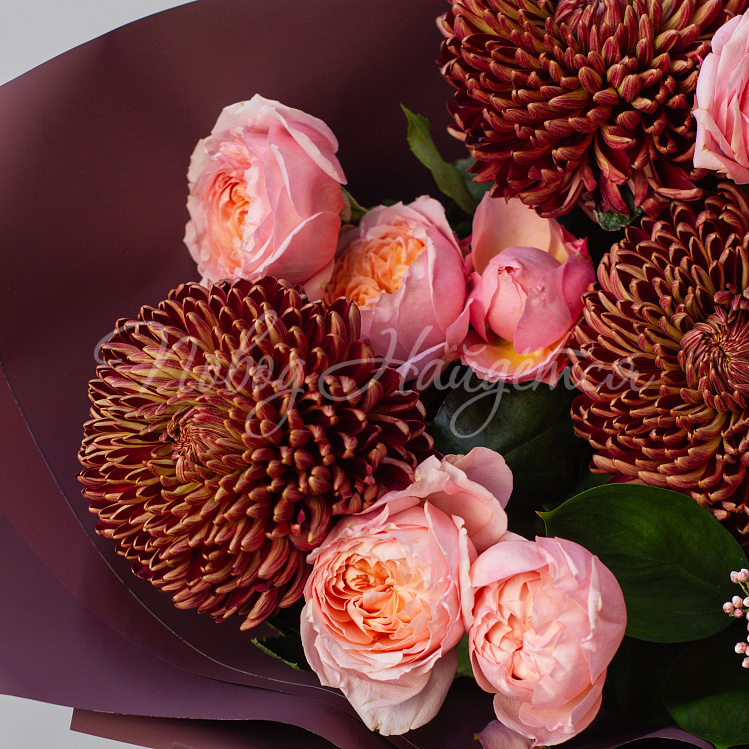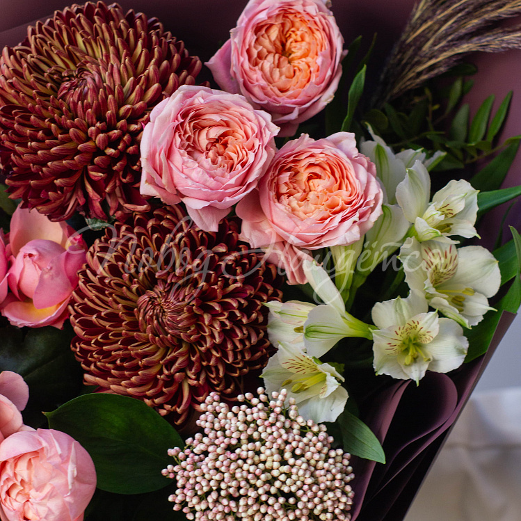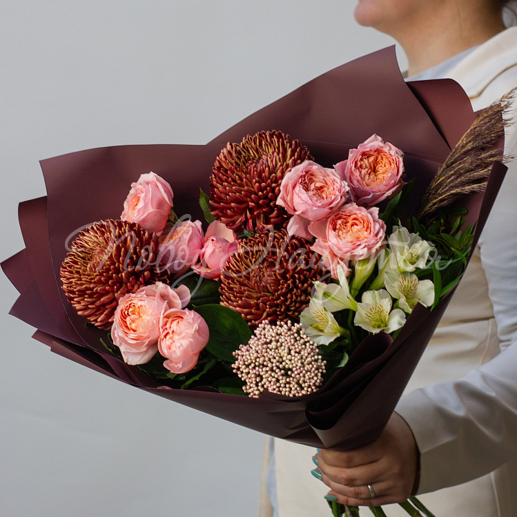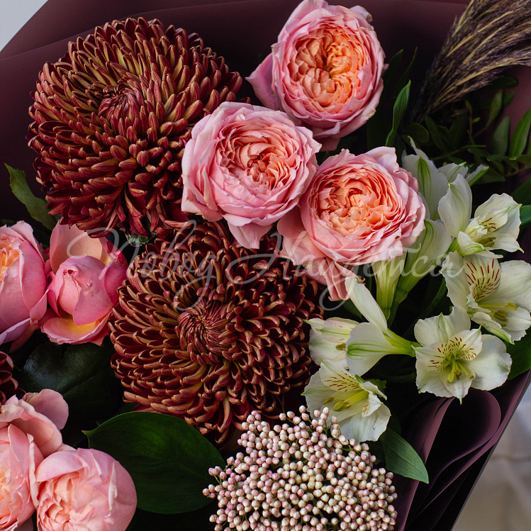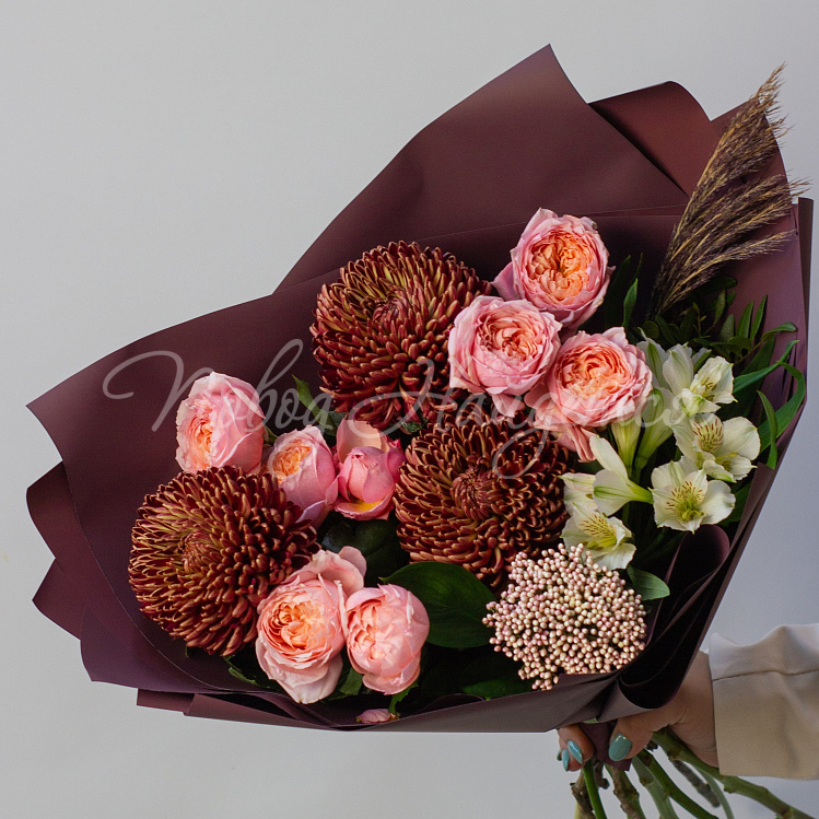 Состав: хризантема одноголовая шоколадная 3шт, роза пионовидная кустовая джульетт 3шт, озотанус розовый 1шт, альстромерия белая 1шт, сухоцвет 1шт, писташ.