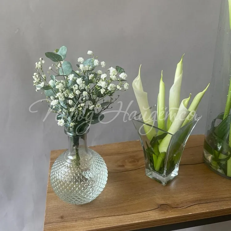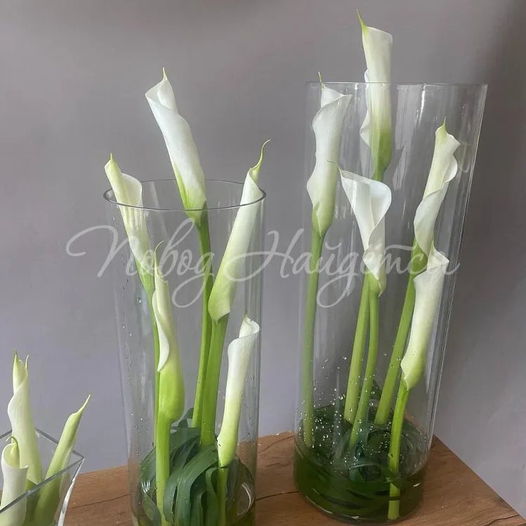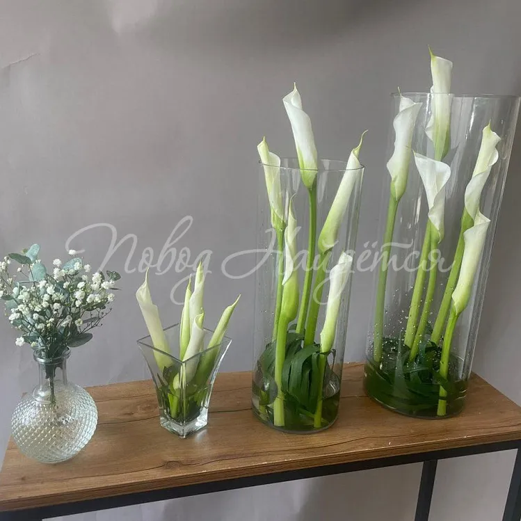 Состав на одну композицию: калла белая 5шт, рускус, аспидистра, вода