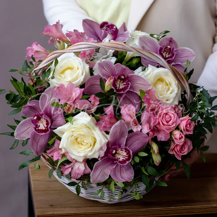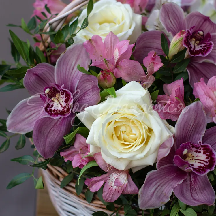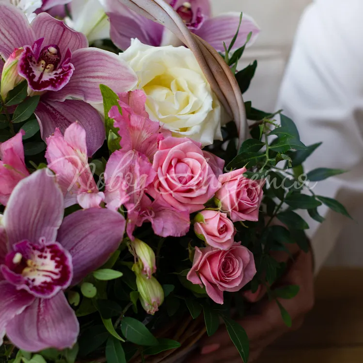 Состав: цимбидиум розовый 5 шт, роза кустовая лидия 1, роза белая 4шт, альстромерия белая 1шт, альстромерия розовая 4шт, писташ, эвкалипт.