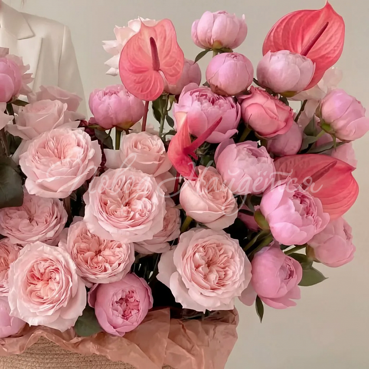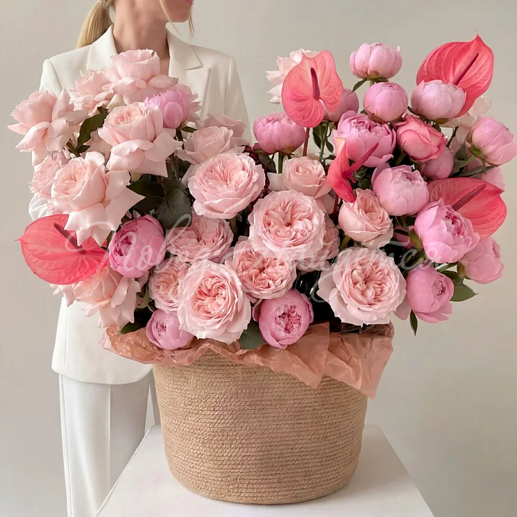 корзина с пионами и розами