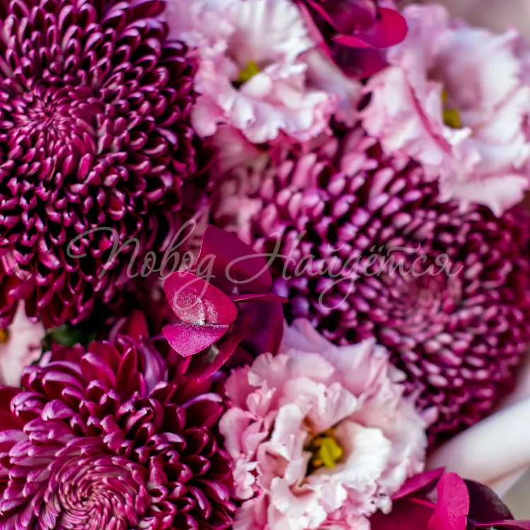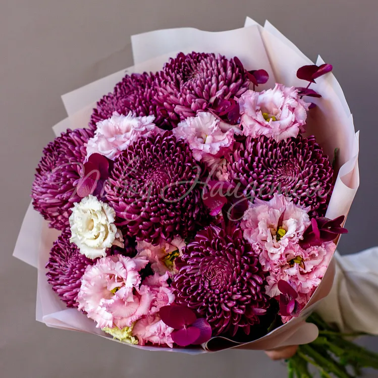 Состав: хризантема винная 7 шт, алиса розовая 5шт, писташ, эвкалипт винный 8шт.