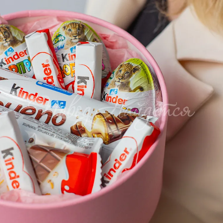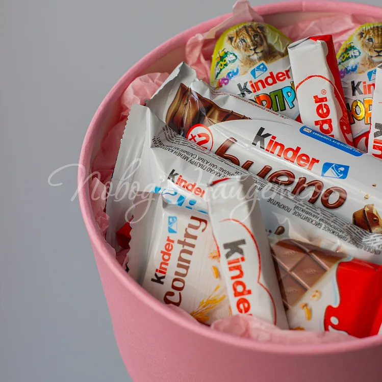 Состав: киндер сюрприз яйцо 3шт, киндер буено 1шт, киндер делиз 1шт, киндер кантри 1шт, киндер палочки 4шт, подложка тишью нежно розовая.