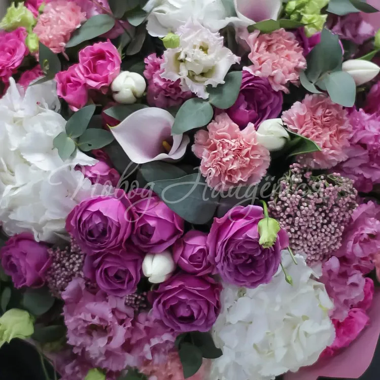Состав: алиса розовая 9шт, гортензия белая голландия 3шт, диантус нежно-розовый 6шт, озотамнус розовый 3шт, роза пионовидная мисти баблз 6шт, орхидея цимбидиум белый 2шт, эвкалипт цинарея, салал.