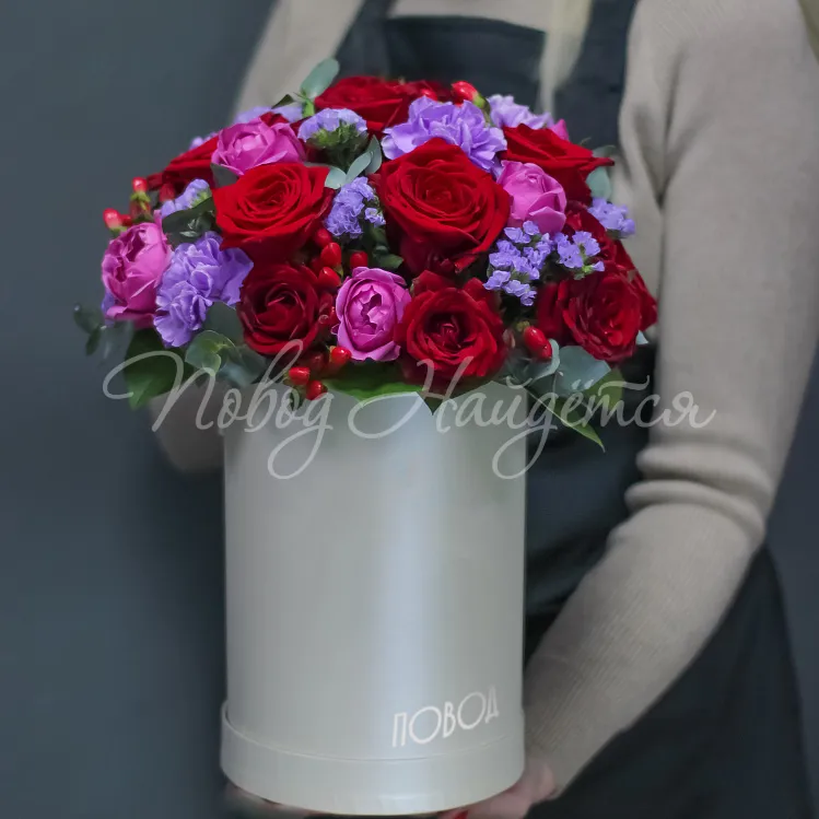 Состав: статица лавандовая 2шт, диантус лунный 5шт, роза пионовидная мисти баблз 2шт, гиперикум красный 2шт, роза красная 50 см 10шт, эвкалипт, салал.