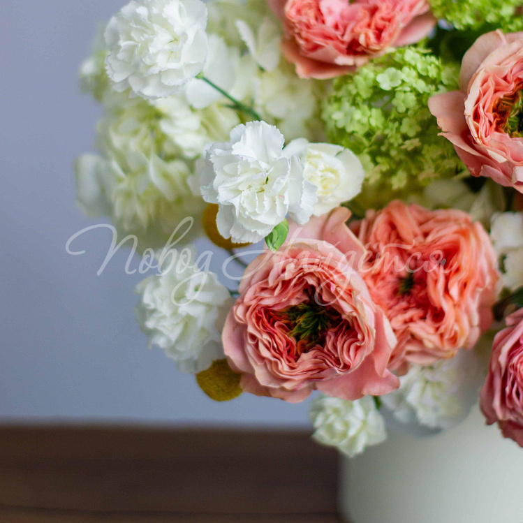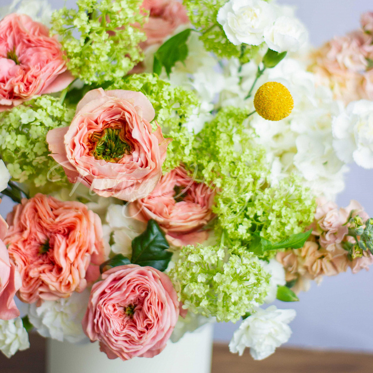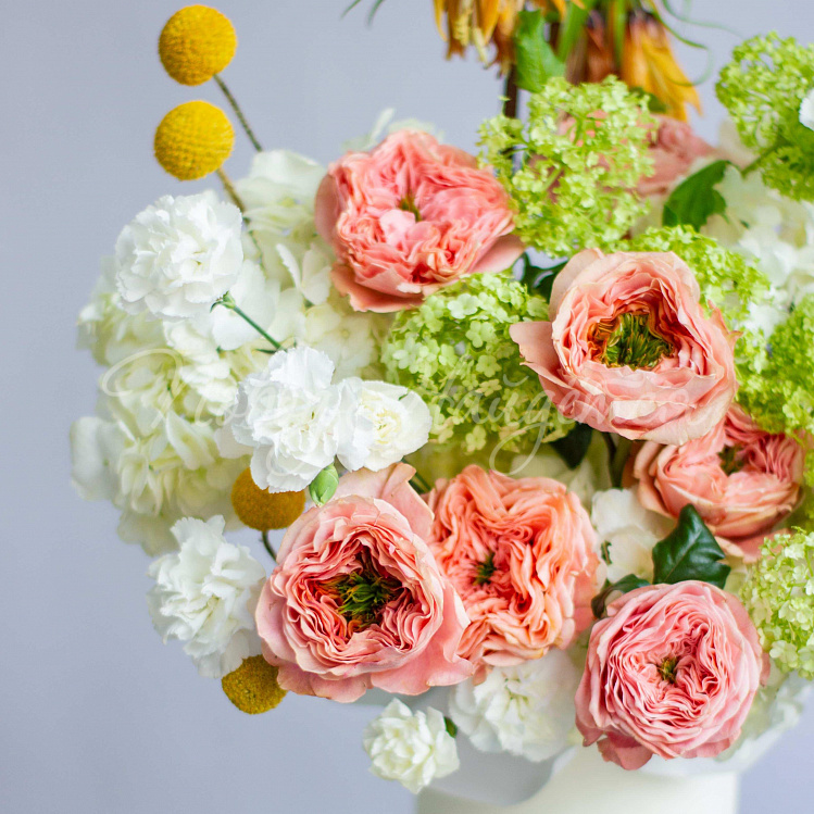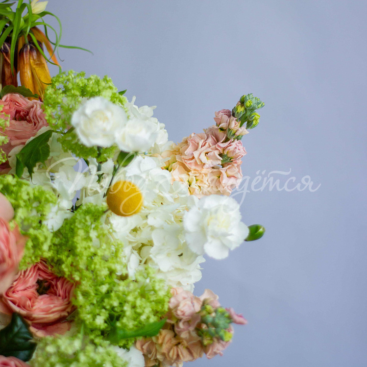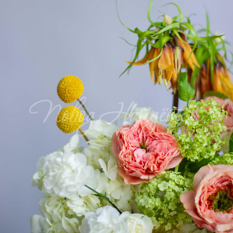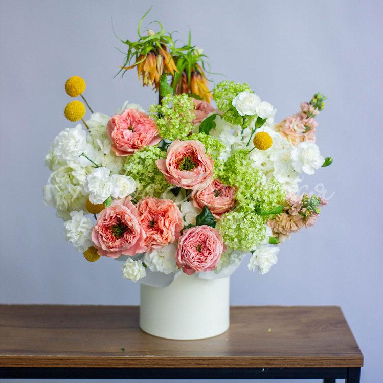 Состав: фритиллярия 2шт, гортензия белая 5шт, роза пионовидная оранж мандарин 10шт, вибурнум зеленый 3шт, матиола кремовая одноголовая 5шт, краспедия 3шт, диантус белый кустовой 6шт.