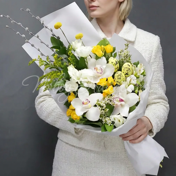 Состав: солидаго 1шт, роза кустовая желтая 2шт, альстрмоерия белая 1шт, цимбидиум белый 3шт, шамилациум белый 1шт, алиса белая 2шт, краспедия 2шт, верба 3шт, яйцо желкое декоративное (или натурального оттенка) 3шт, рускус 3шт, салал.
