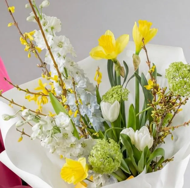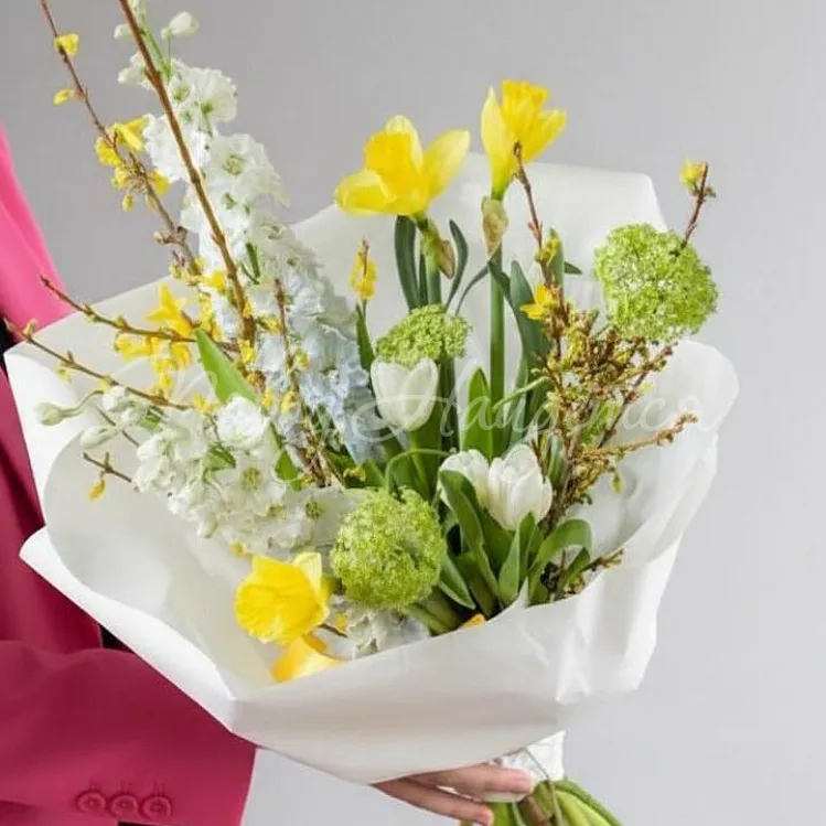 Состав: ветки форзиции 2шт, вибурнум зеленый 1шт, нарцисс желтый одноголовый 3шт, тюльпан белый 5шт, маттиола белая кустовая 2шт, писташ.