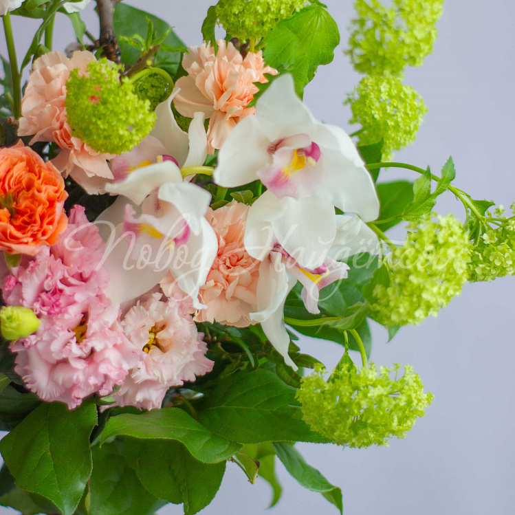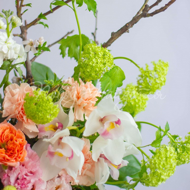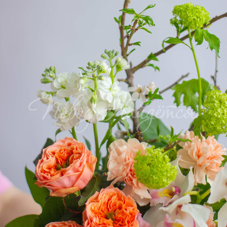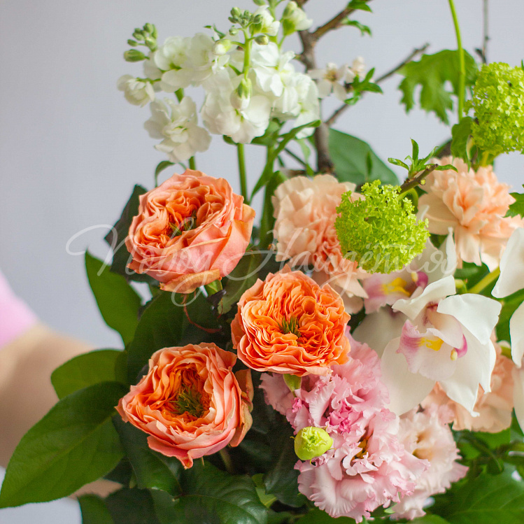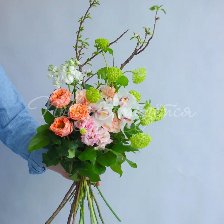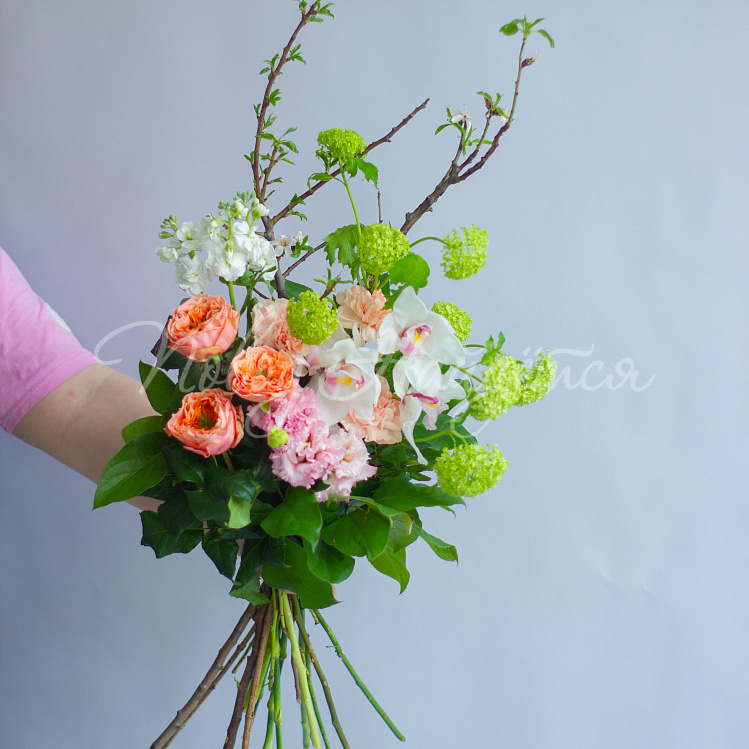 Состав: ветки плодовые 2шт, вибурнум зеленый 2шт, роза пионовидная оранж мандарин 3шт, орхидея цимбидиум ветка 1/2, эустома алиса розовая 1шт, маттиола белая кустовая 1шт, диантус кремовый 3шт, писташ, салал.