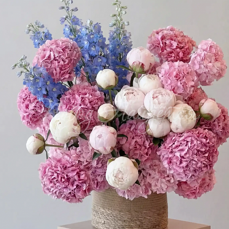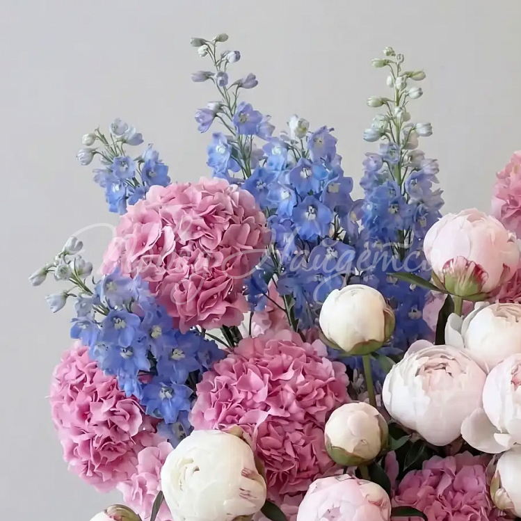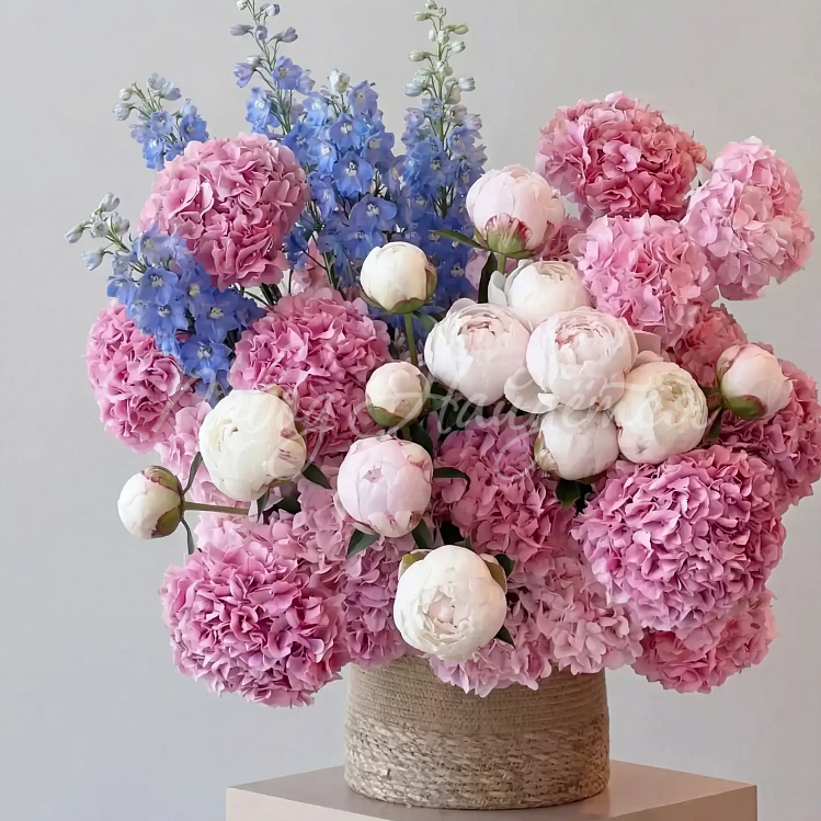 Состав: гортензия розовая голландия 25шт, дельфиниум голубой 7шт, пион белый 20шт.
