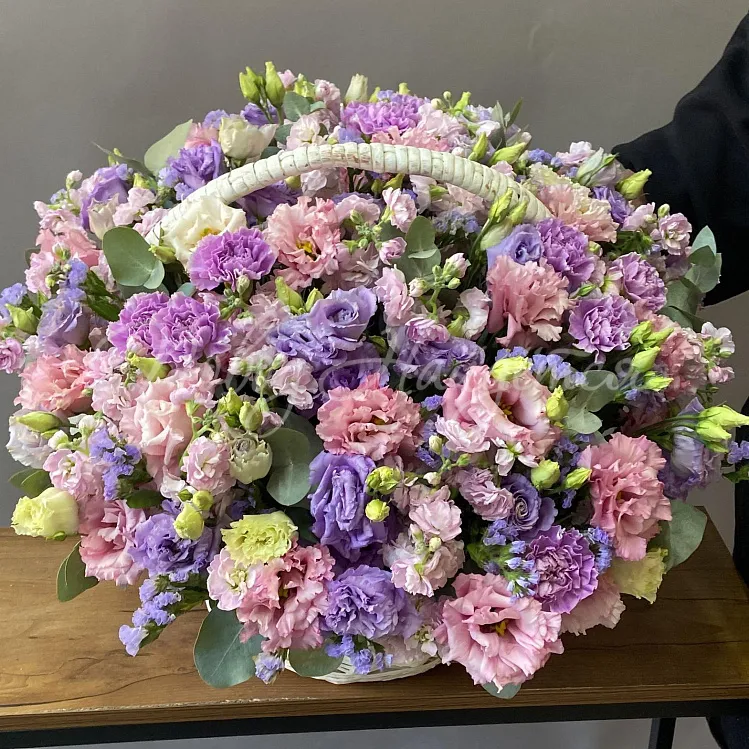 Состав: алиса розовая 15шт, эустома лавандовая 6шт, диантус лунный 10шт (группами), статица лавандовая 10шт, матиола лавандовая светлая 10шт, эвкалипт цинарея, биофлора