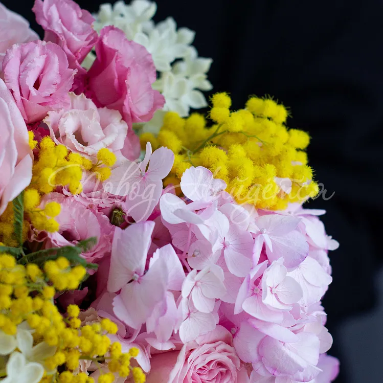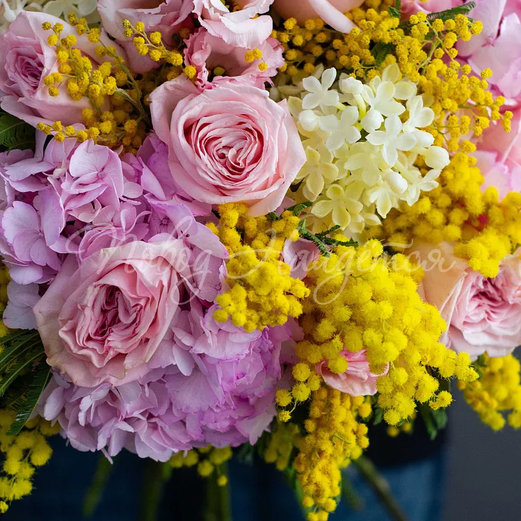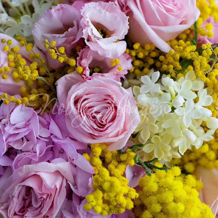 Состав: гортензия розовая 3шт, сирень белая 5шт, роза пионовидная ароматная пинк о хара 11шт, эустома алиса розовая 5шт, маттиола белая кустовая 4шт, мимоза 1,5 пучка, писташ.
