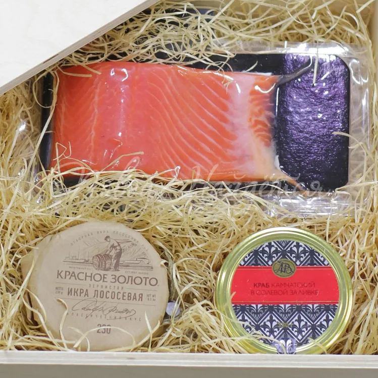 Состав: икра красная 230 гр, краб в солевой заливке 180г стекло, красная рыба, наполнитель.