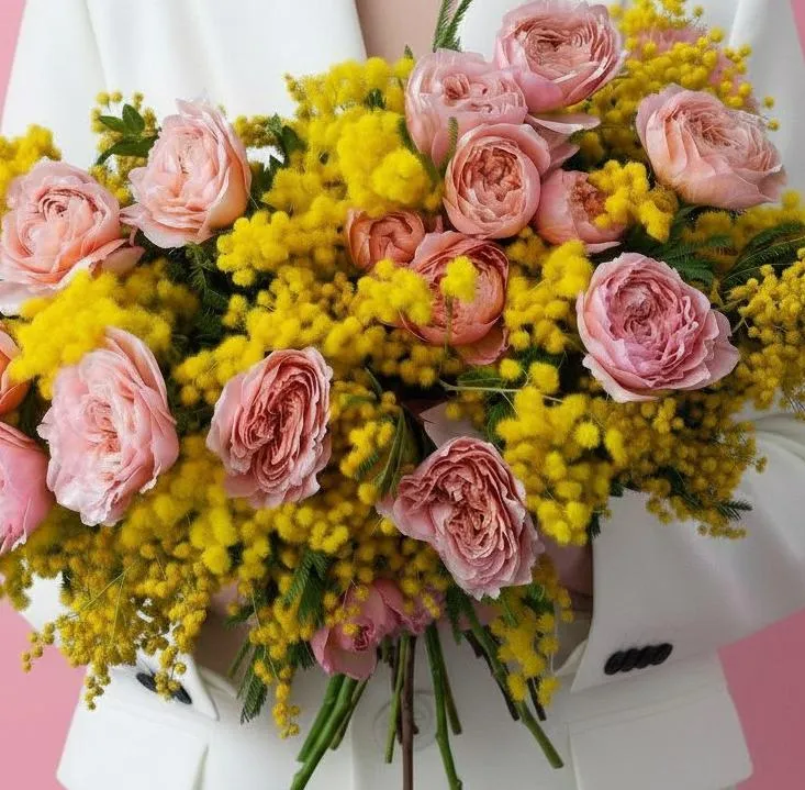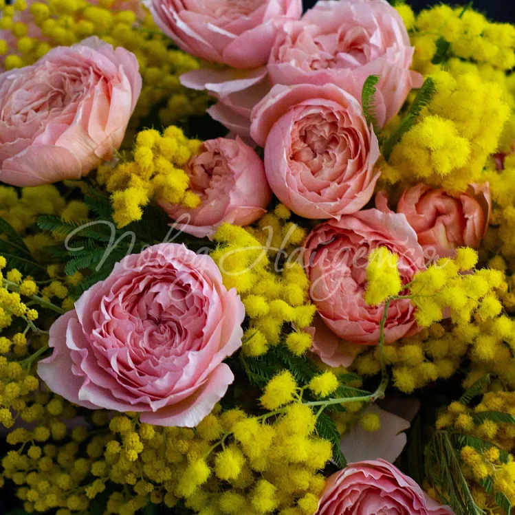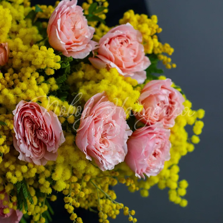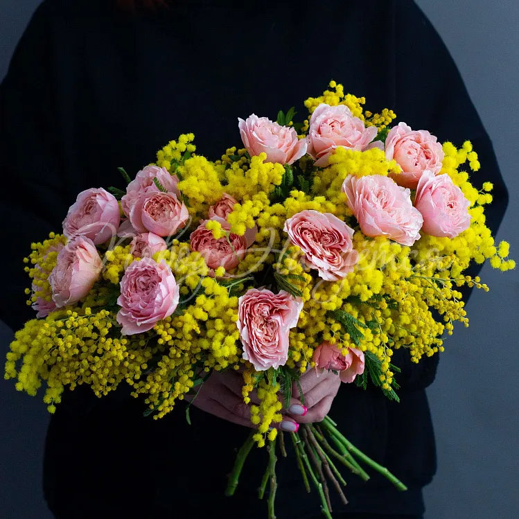 Состав: мимоза пучок, роза пионовидная кустовая джульетт 5шт.