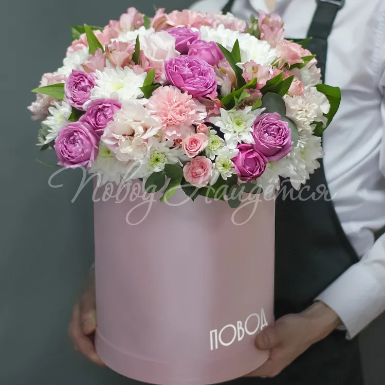 Состав: альстромерия розовая 4шт, хризантема евро белая 3шт, диантус нежно-розовый 5шт, роза кустовая лидия 5шт, роза пионовидная малиновая мисти баблз 3шт, лизиантус розовый алиса - 2шт, салал, эвкалипт цинарея, биофлора.