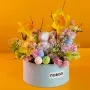 Состав: статица лавандовая 2шт, роза пионовидная пинк о хара 2шт, пионовидная роза Мисти баблз 2шт, роза белая 50 см - 4шт, диантус салатовый 3шт, гиперикум белый 2шт, солидаго 2шт, желтая роза 5шт,альстромерия белая 2шт, краспедия 2шт, эвкалипт цинарея, салал.