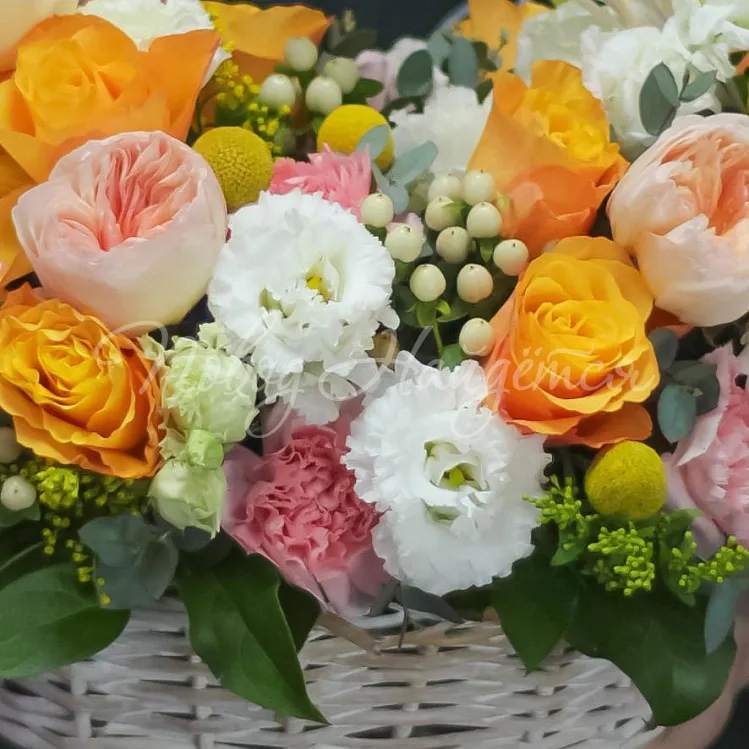 Состав: пионовидная роза джульетт 3шт, роза кения оранжевая мери клер 40 см - 10шт, диантус розовый 9шт, гиперикум белый 5шт,краспедия 5шт, алиса белая 3шт, салал, эвкалипт цинарея.