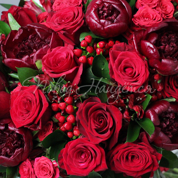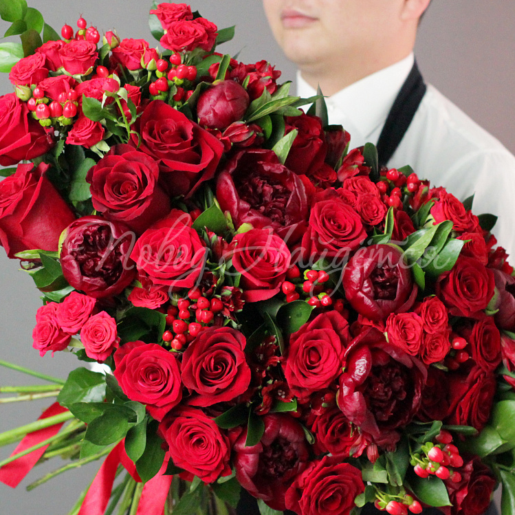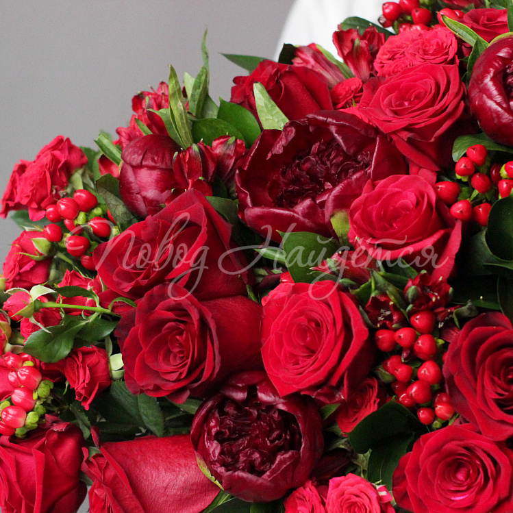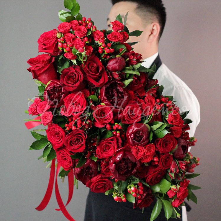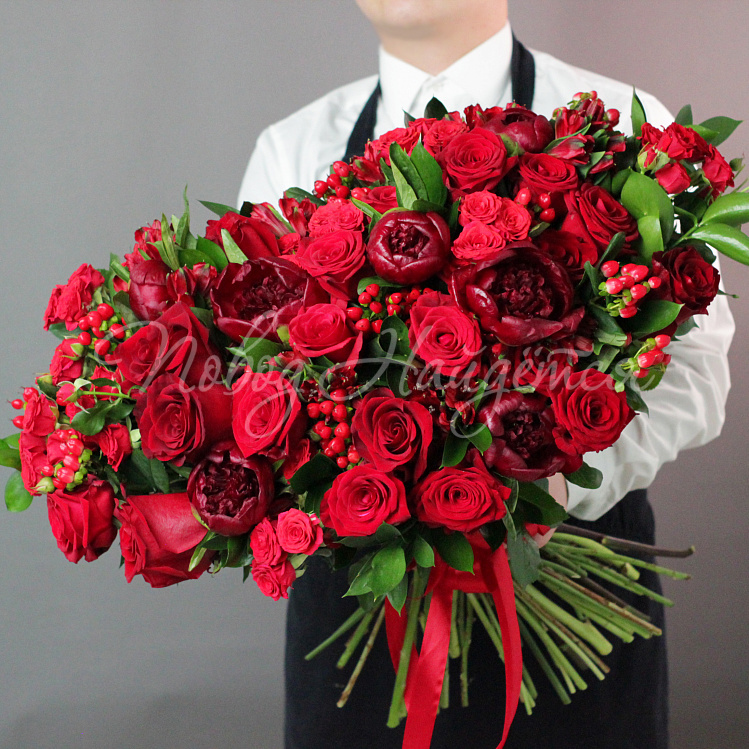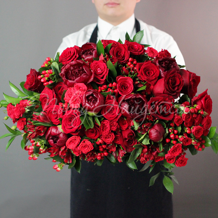 Состав: пион бордо 7 шт, роза красная 60 см 10 шт, роза красная 50 см 10 шт, роза кустовая красная 10 шт, альстромерия красная 10 шт, гиперикум красный 10 шт, рускус 20 шт