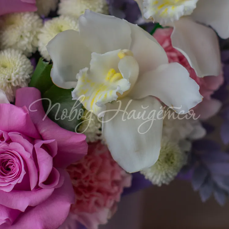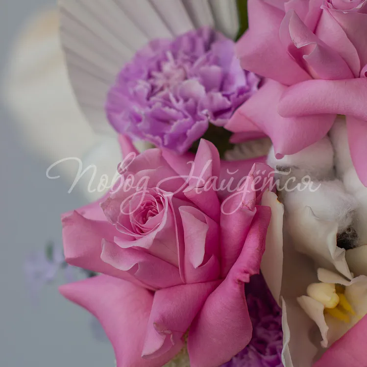 Состав: орхидея цимбидиум белый 3шт, роза фиолетовая 5шт, евро белая 1, сантини белая 1, хлопок 3шт, диантус нежно розовый 2шт, диантус лунный 3шт, папоротник белый 2шт, лист пальмы ромб сухоцвет белый 1шт.