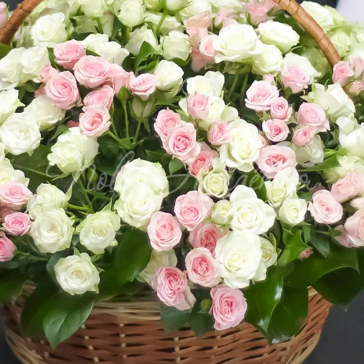 Состав: розовая кустовая роза лидия - 50 см - 21 шт, белая кустовая роза 50 см - 30 шт., писташ/салал.