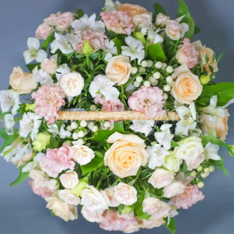 Состав: роза кремовая пинч аваланш 50 см - 10шт, роза кустовая кремовая - 8шт, гиперикум белый 3шт, альстромерия белая 6шт, эустомая шампань кремовая 8шт, салал 2/4, писташ 2/4.