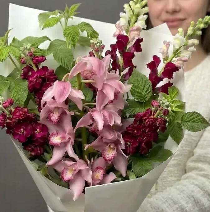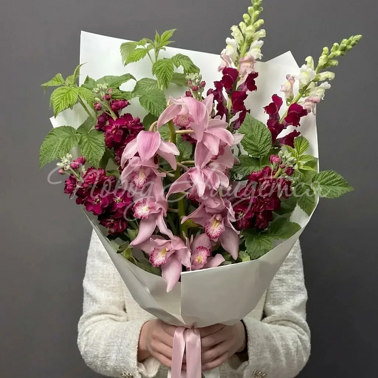 Состав: орхидея цимбидиум светло розовый 1 ветка, антирринум малиновый 5шт, малина 5шт, писташ.