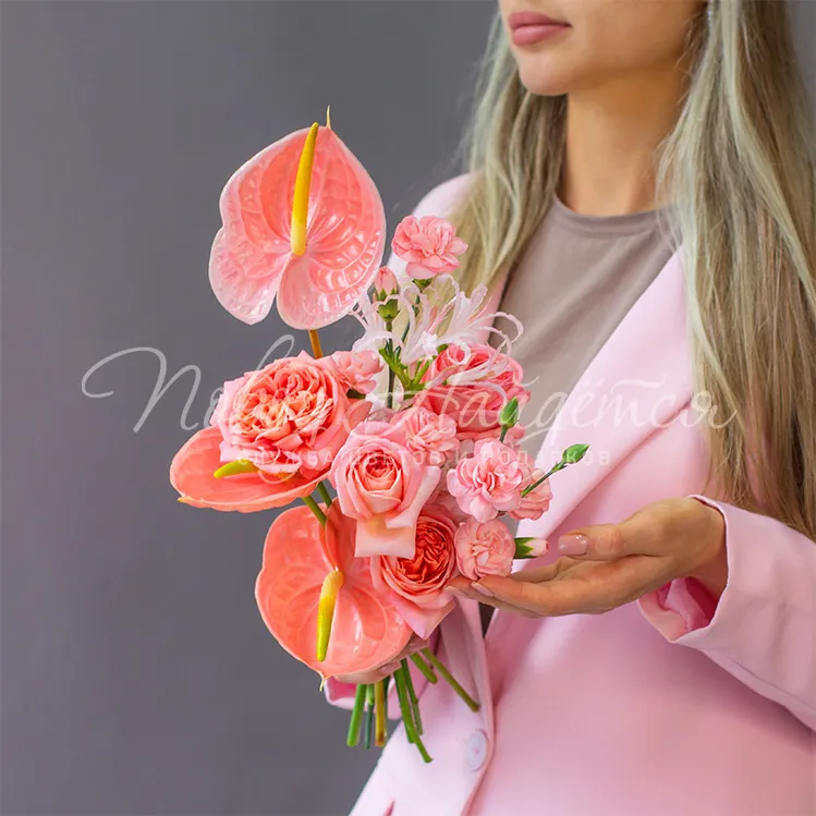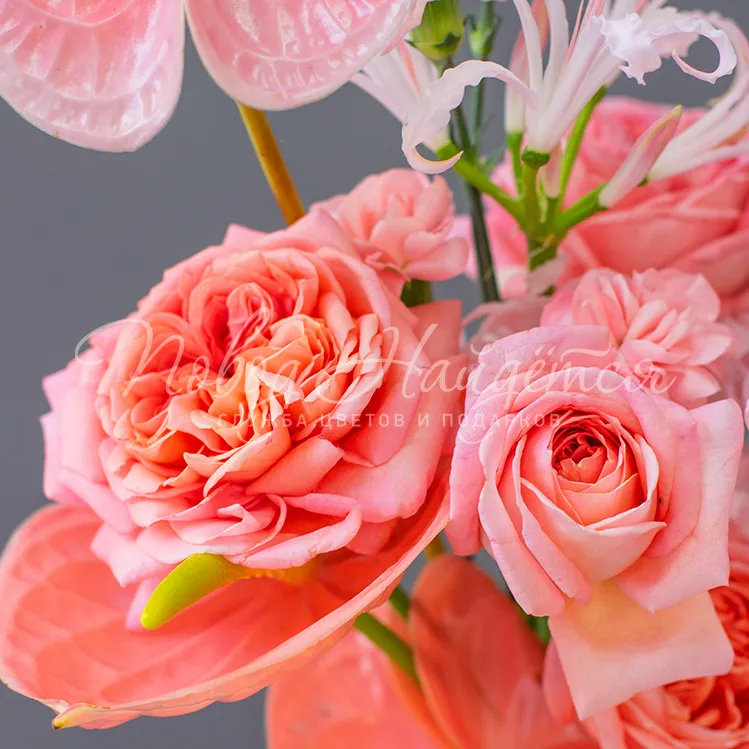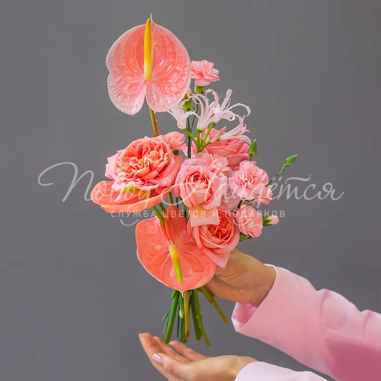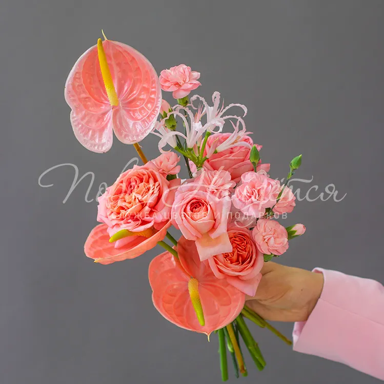 Состав: антуриум коралловый 3 шт, диантус кустовой розовый 3 шт, роза вувузела 5 шт, нарине 1 шт