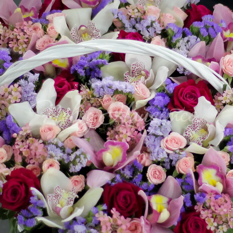 Состав: орхидея цимбидиум белая - 7шт, орхидея цимбидиум розовая - 10шт, роза кустовая розовая "лидия" 50 см - 10шт, роза малиновая 40-50 см - 10шт, статица лавандовая - 5шт, шамилациум розовый - 7шт, салал.