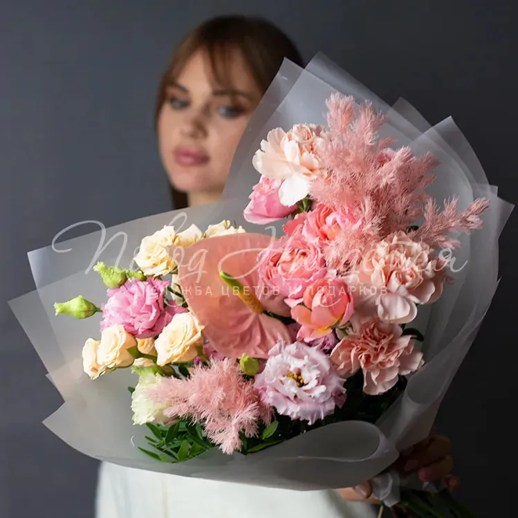 Состав: роза пионовидная кустовая джульетт 1шт, антриум розовый 1 шт, роза кустовая кремовая яна 2шт, эустома алиса розовая 2 шт, диантус кремовый 5шт, аспарагус розовый 2шт, писташ.