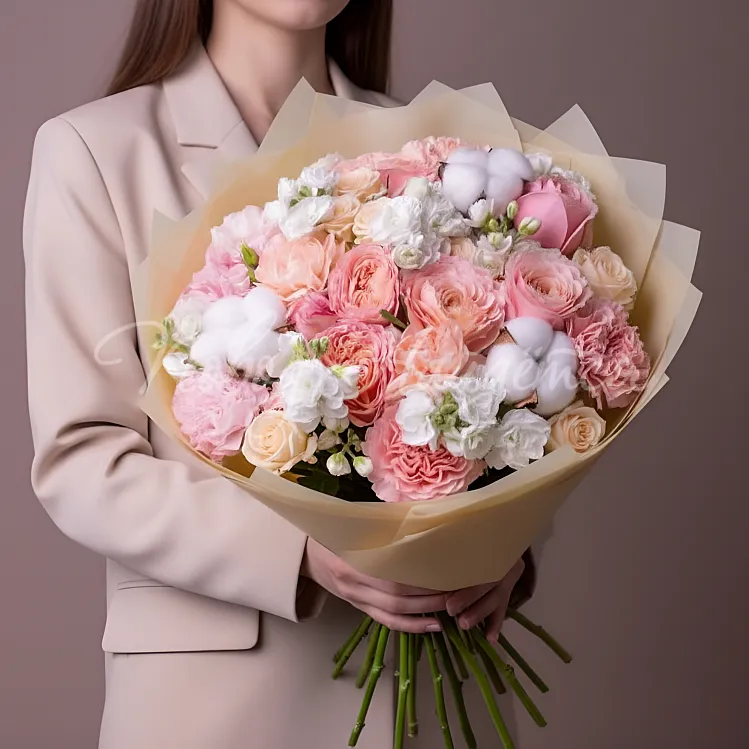 Состав: роза пионовидная кустовая джульетт 2шт, роза кустовая кремовая яна 2шт, маттиола белая 3шт, хлопок 5шт, гвоздика нежно розовая одноголовая 4шт, гвоздика кремовая 3шт, писташ.