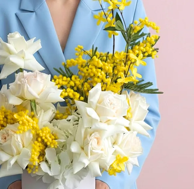 Состав: гортензия белая 1шт, роза пионовидная вайт о хара 11шт, мимоза 1/2 пучка, ветки форзиции 2шт.
