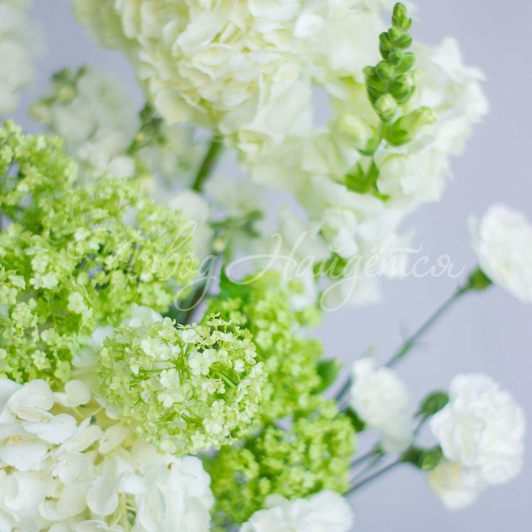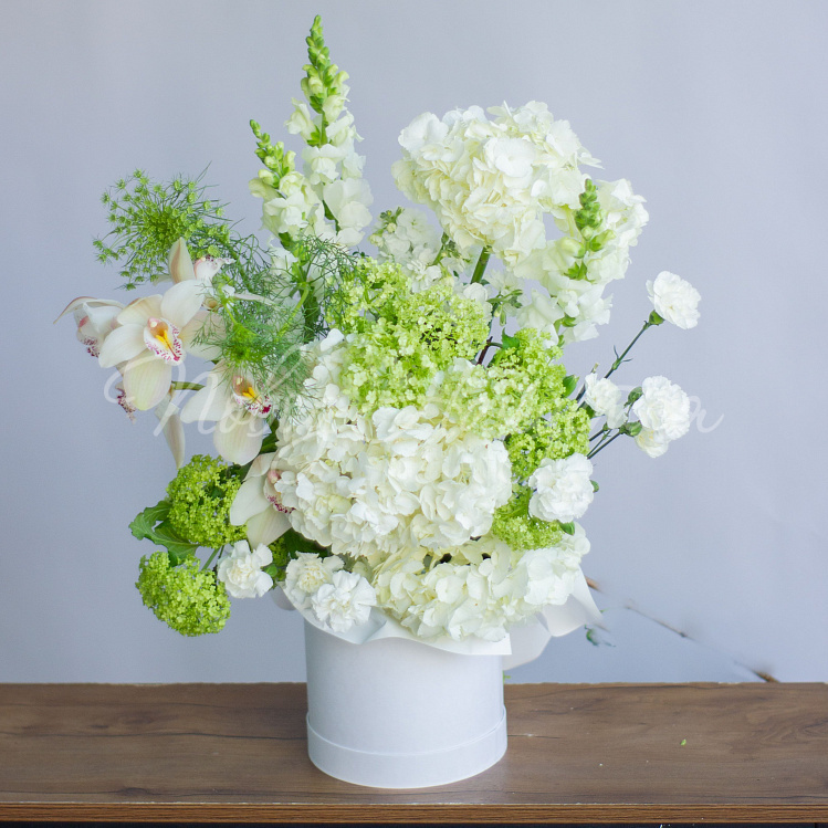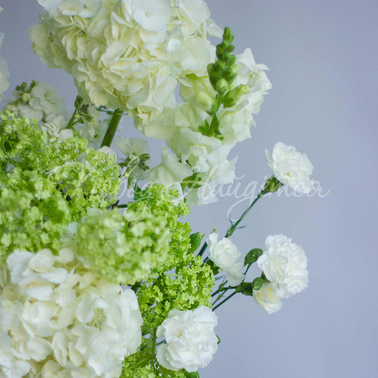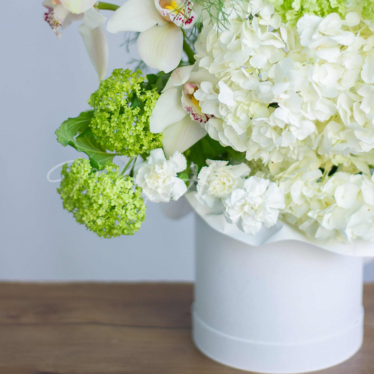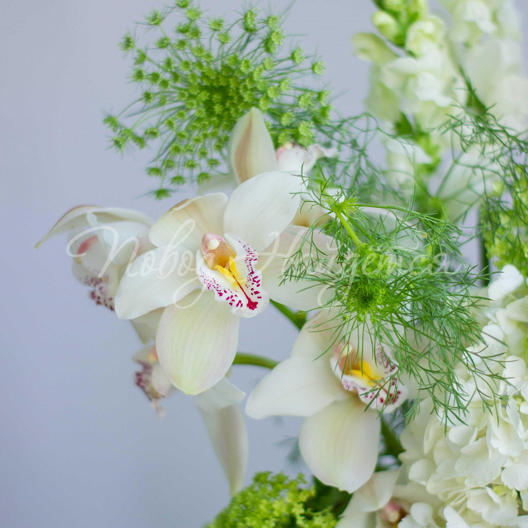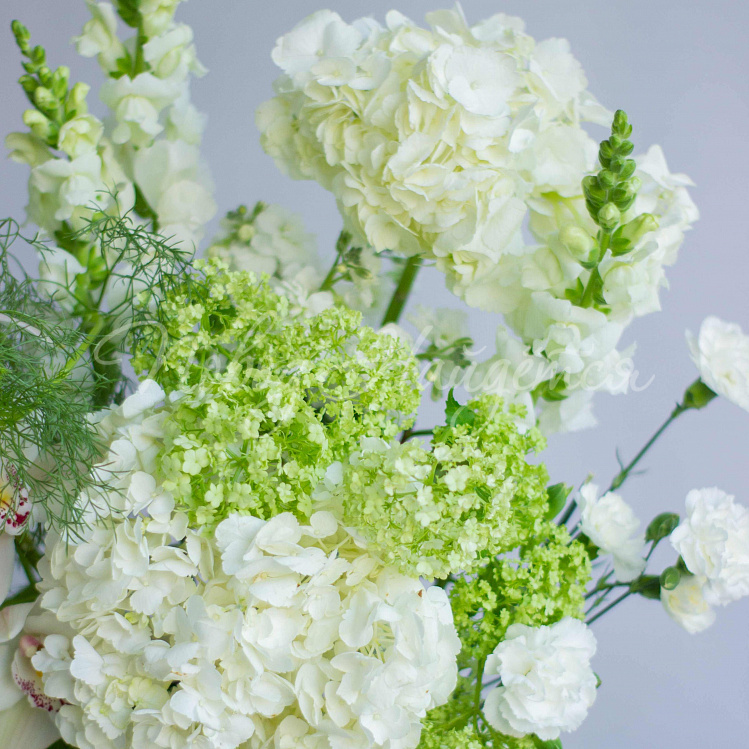 Состав: гортензия белая 5шт, вибурнум 4шт, орхидея цимбидиум белая 1 ветка, антиринум белый 5шт, матиола кустовая белая 1шт, диантус белый кустовой 3шт, амми 1 шт.