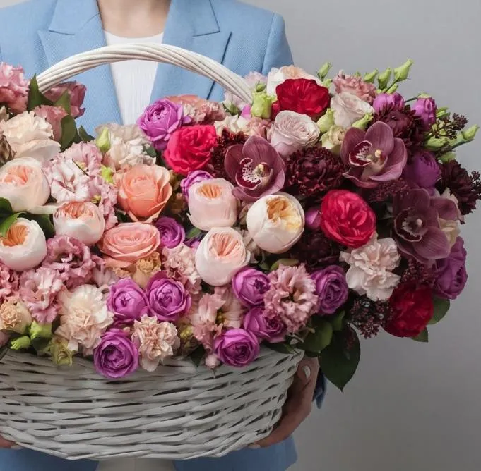 Состав: роза пионовидная джульетт - 12шт, пионовидная роза Мисти баблз 10 шт, пионовидная роза кахала 10шт, диантус кремовый 20шт, цимбидиум темно розовый 5шт, пионовидная роза красная ред пиано 10шт, роза кремовая мабелла 10 шт, лизиантус алиса розовый 20шт, скимия красная 1 пучок, хризантема одноголовая деко 10шт, леукадендрон шишками 10шт, Нежно-розовая роза Сеншел Sensual - 30шт, Роза Свит аваланш Кремово-Розовая - 50 см, эвкалипт цинарея пучок