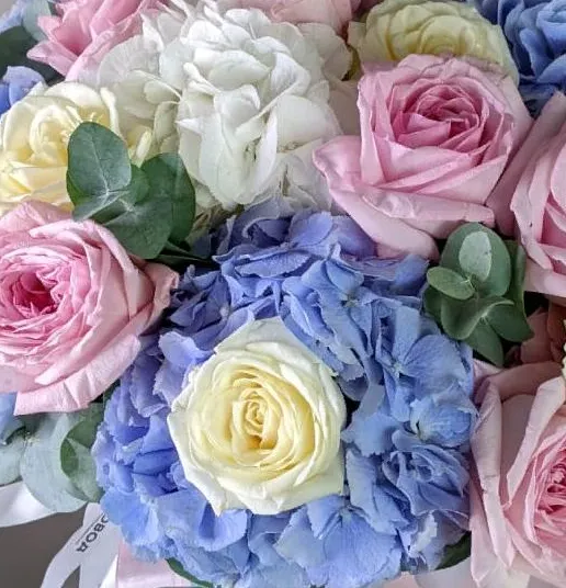 Состав: гортензия голубая 5 шт, гортензия розовая 2 шт, гортензия белая 1 шт, роза белая 10 шт, роза пионовидная пинк охара 12 шт, эвкалипт цинарея 1 шт, писташ