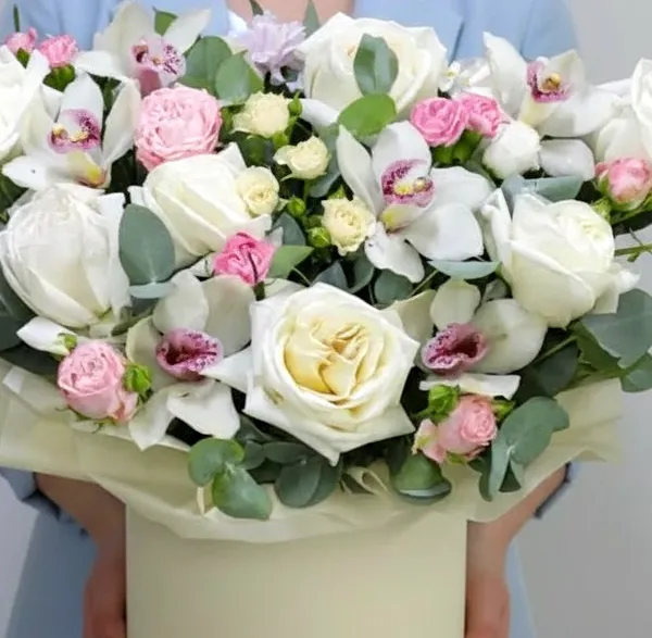 Состав: роза пионовидная вайт о хара 7 шт, орхидея цимбидиум белый 7 шт, роза пионовидная бомбастик 2 шт, диантус кустовой розовый 3 шт, роза кремовая кустовая 3 шт, эустома белая 3 шт, эвкалипт цинарея