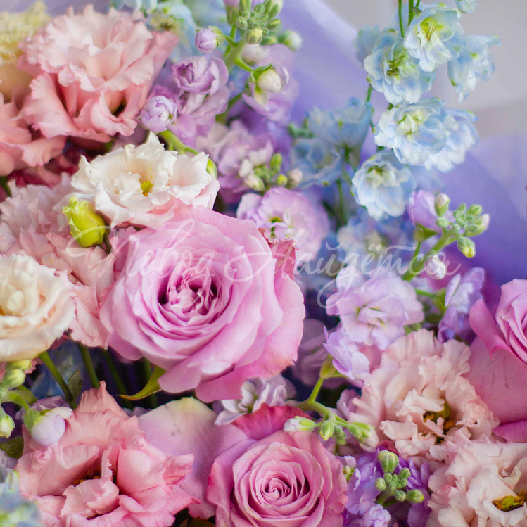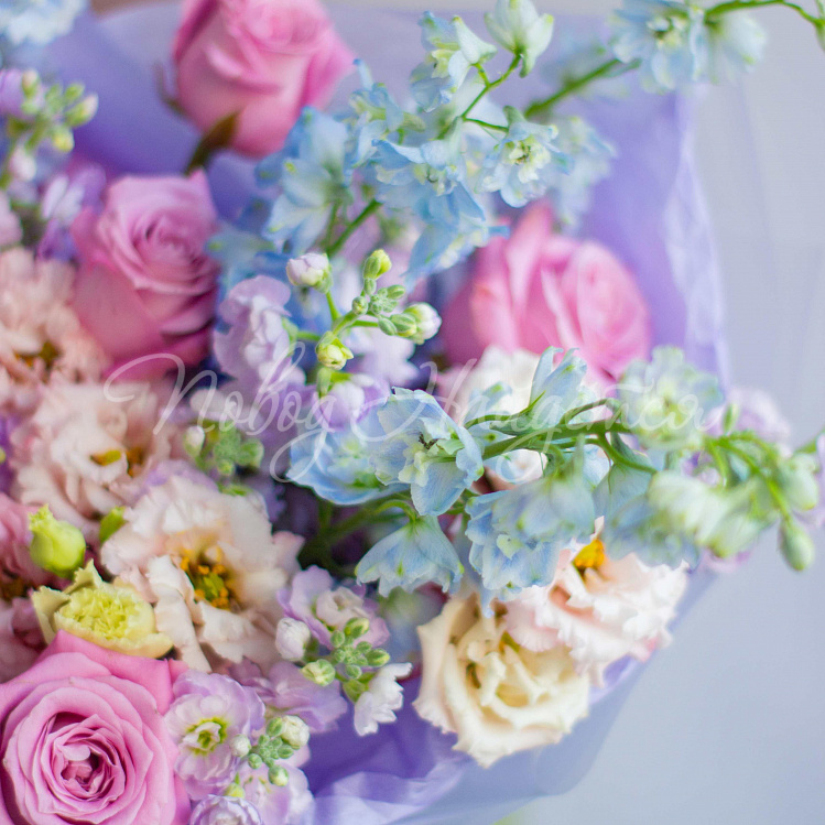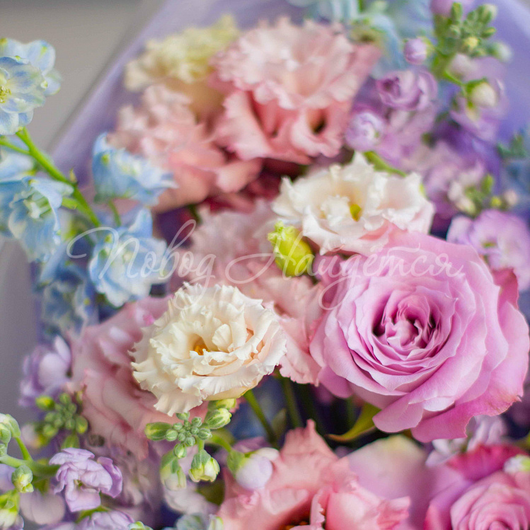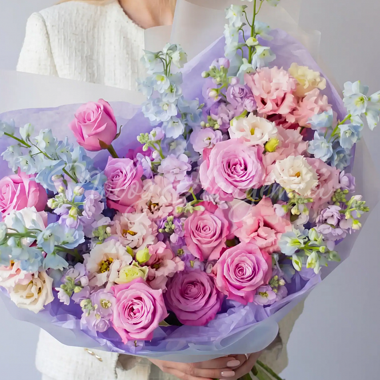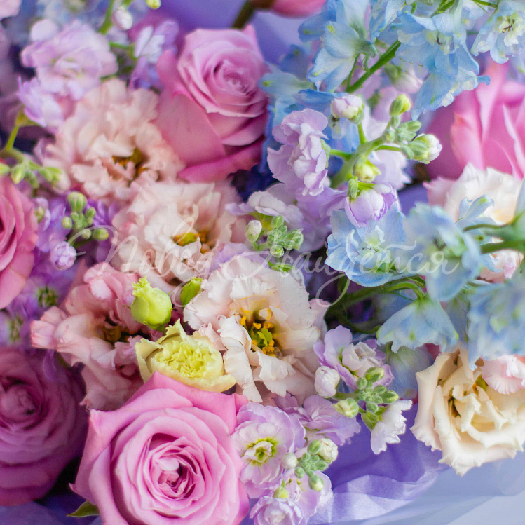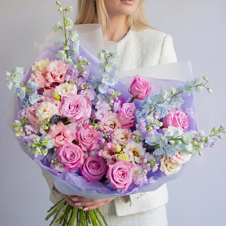 Состав: дельфиниум голубой 6шт, матиола лавандовая кустовая 6шт, алиса розовая 4шт, роза фиолетовая 10шт, писташ.