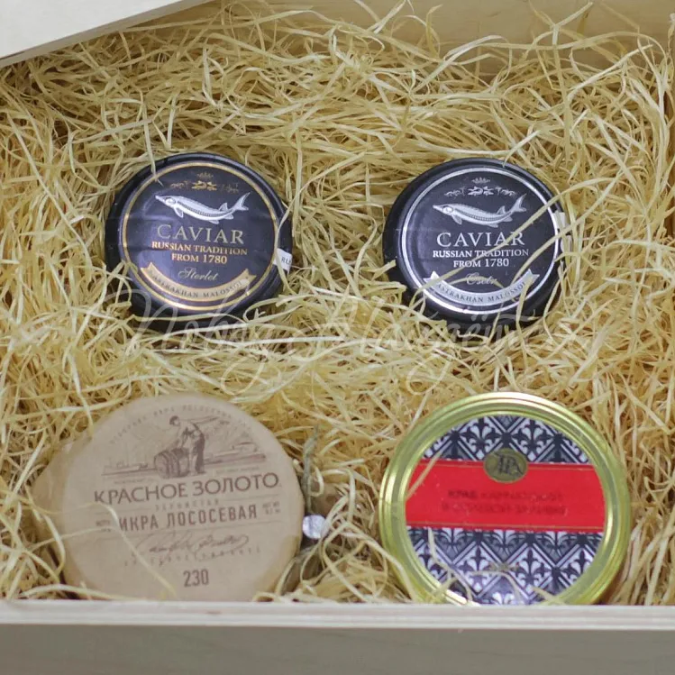 Состав: икра осетра 50 гр, икра стерляди 50 гр, икра красная 230 гр, краб в солевой заливке 180г стекло, наполнитель.