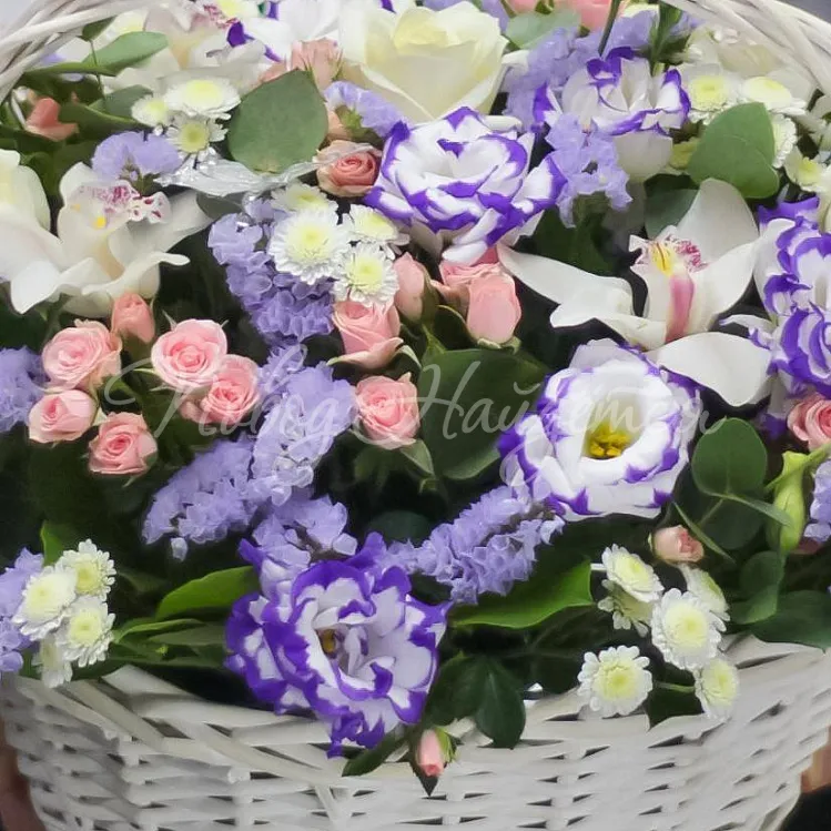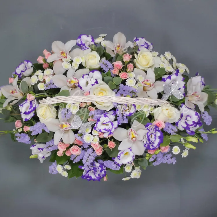 Состав: цимбидиум белый - 8шт, роза "аваланш" - 5шт, статица лавандовая 3шт, кустовая роза нежно розовая "лидия" - 5шт, лизиантус белый - 3шт, ливиантус лавандовый 3шт, сталион белый - 3шт, бабочки декоративные - 2шт серебро, салал.