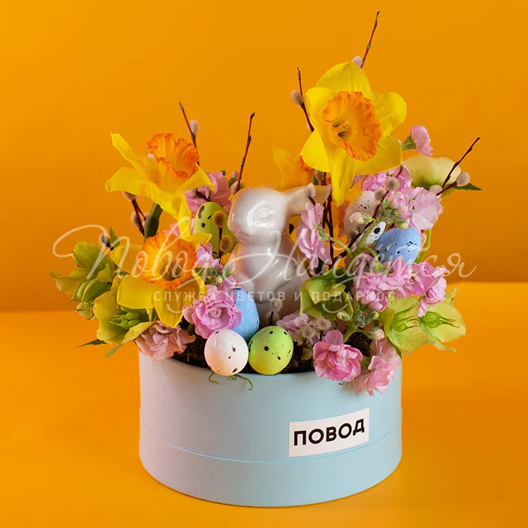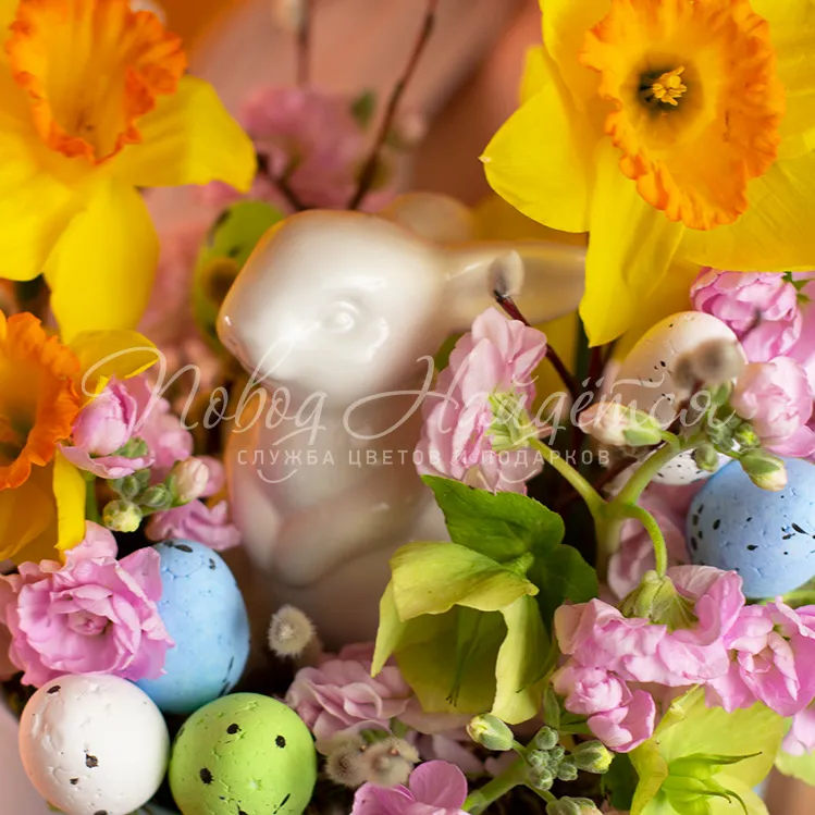 Состав: верба 1 пучок, маттиола кустовая розовая 1 шт,нарцисс одноголовый 5 шт, хелеборус 0,2 шт, яйца пасхальные(декор) 8 шт, заяц керамический 1 шт, мох