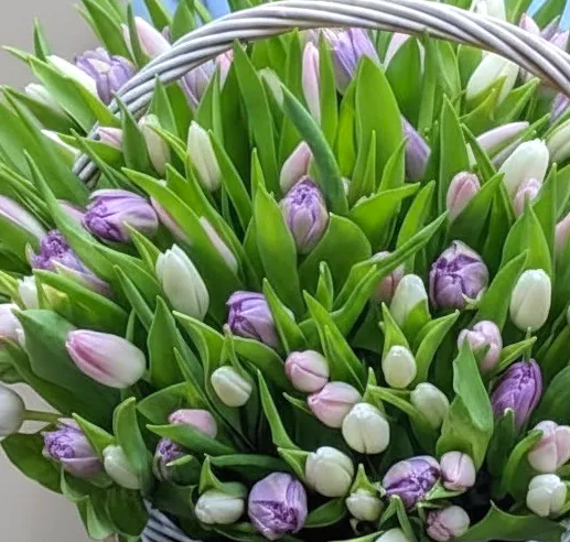 Состав:тюльпаны голландия белые 20 шт, тюльпан нежно-розовый 25 шт, лавандовый -30 шт