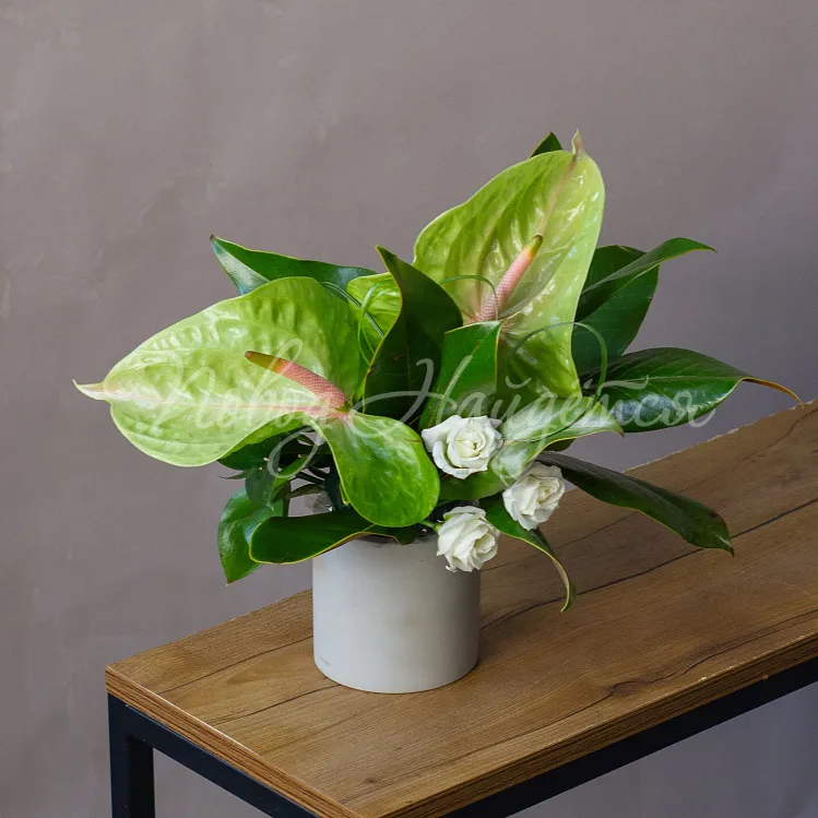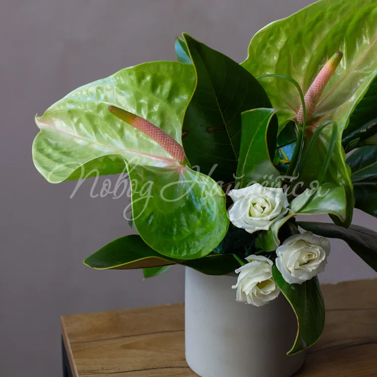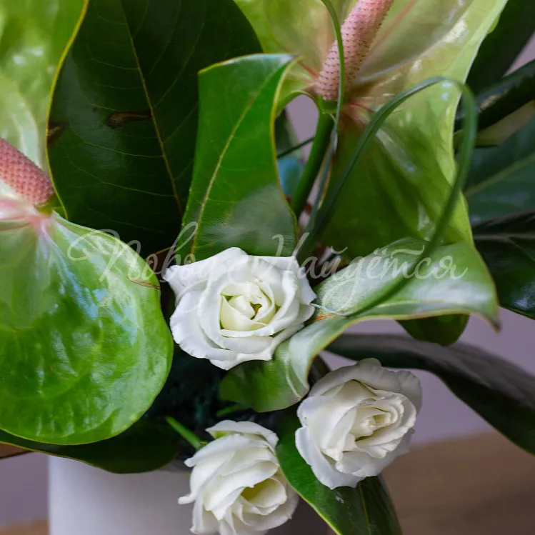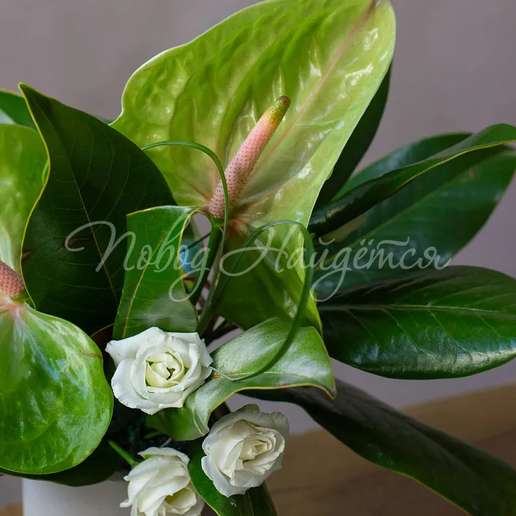Состав: антриум зеленый 2шт, лизиантус белый 2шт, магнолия 2шт, рускус 3шт, берграсс 1/10.