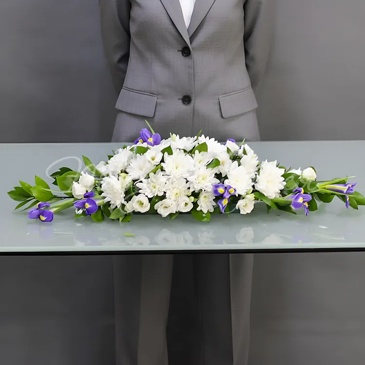Состав: эустома белая 2шт, хризантема евро белая 2шт, ирис 7шт, рускус израильский 5шт, салал, писташ.
