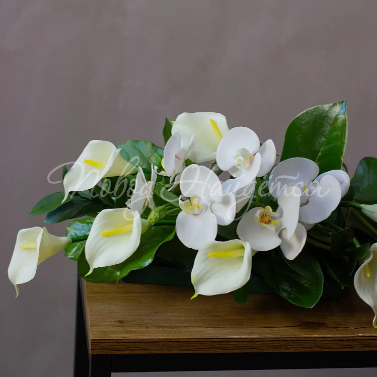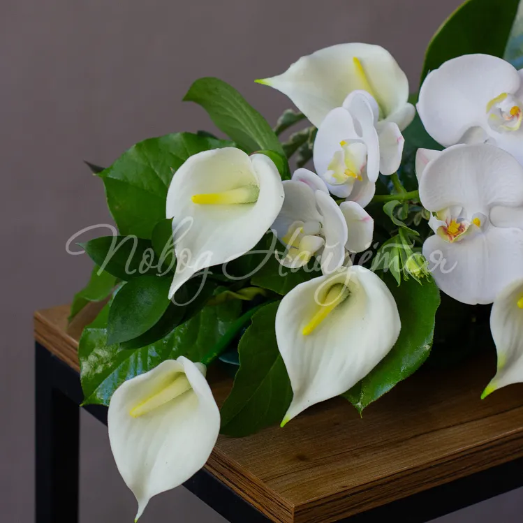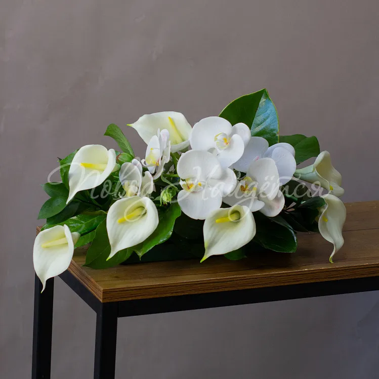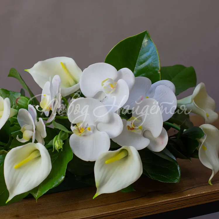 Состав: калла белая 9шт, орхидея фаленопсис ветка 1шт, магнолия 1шт, салал 1/4, рускус 1шт, аспидистра 3шт.