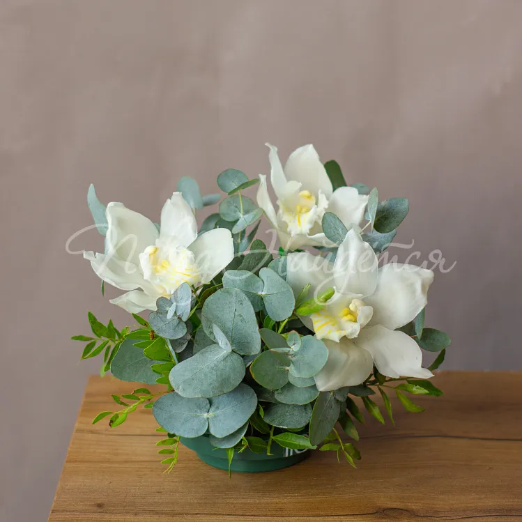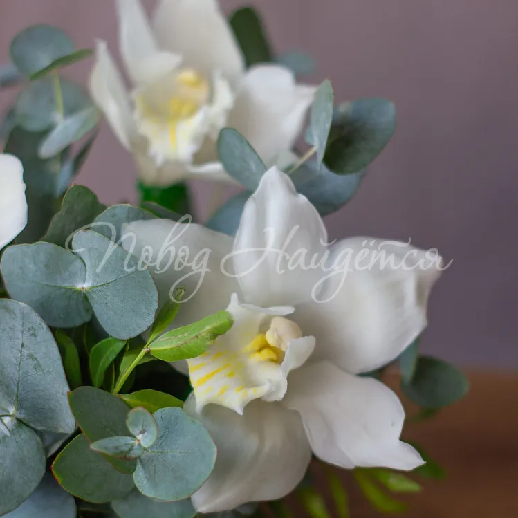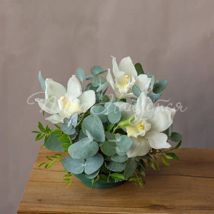 Состав: орхидея цимбидиум белая 3 шт, писташ, эвкалипт.
