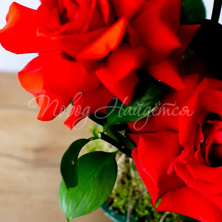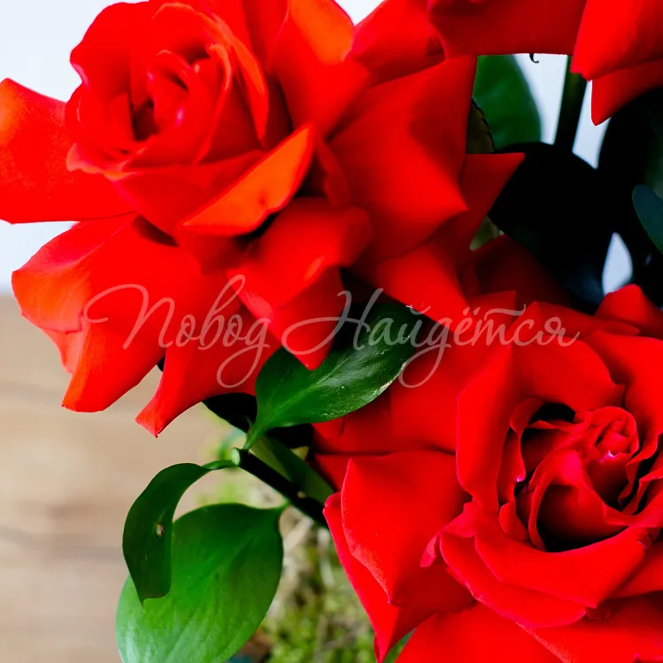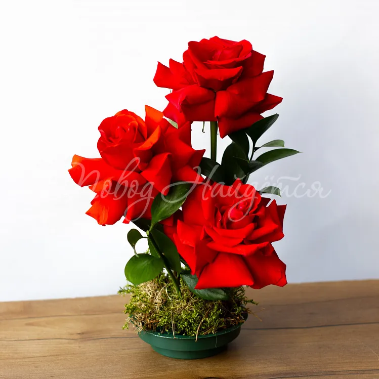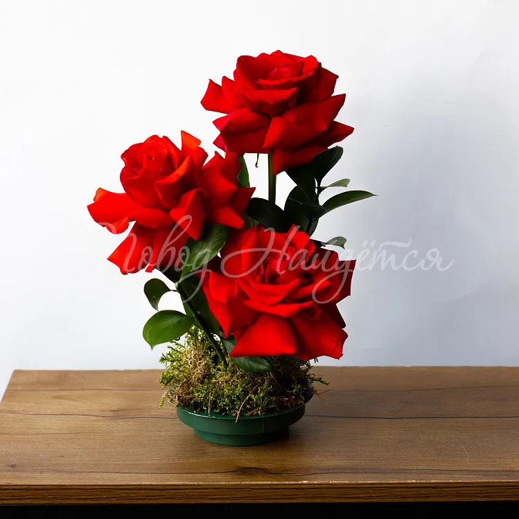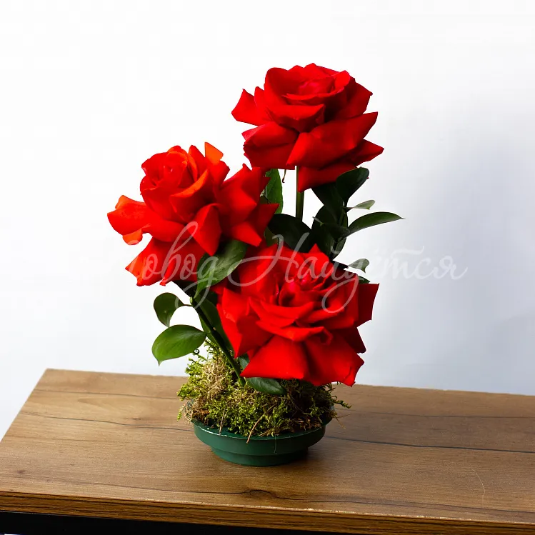 Состав: роза французская красная - 3шт, рускус 2шт, мох.