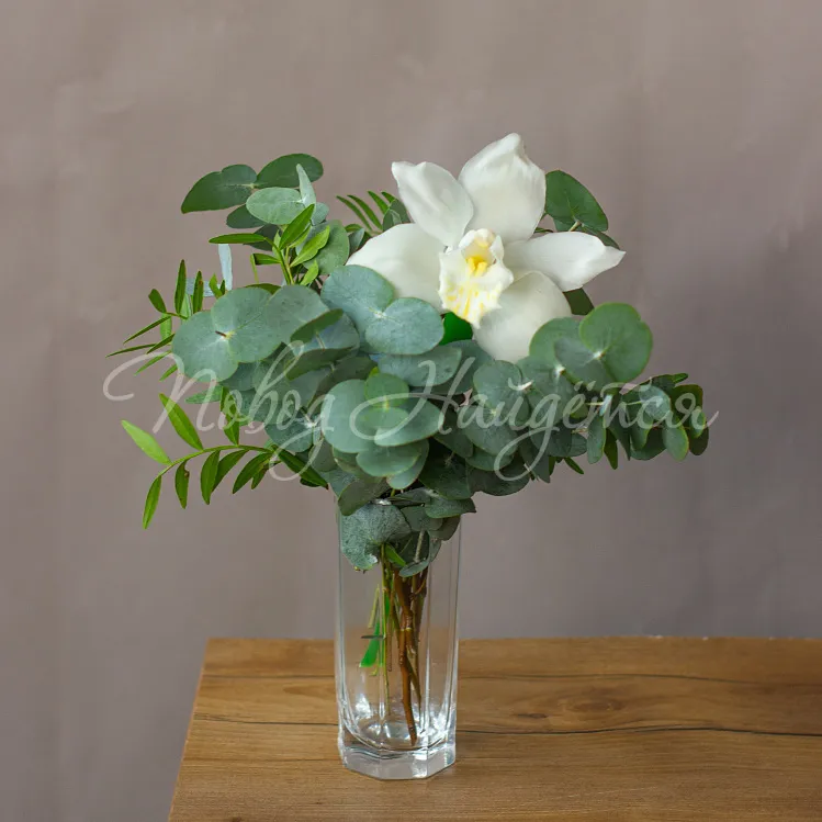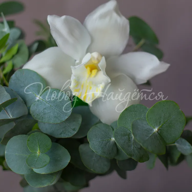 Состав: орхидея цимбидиум белый 1 шт, эвкалипт, писташ.