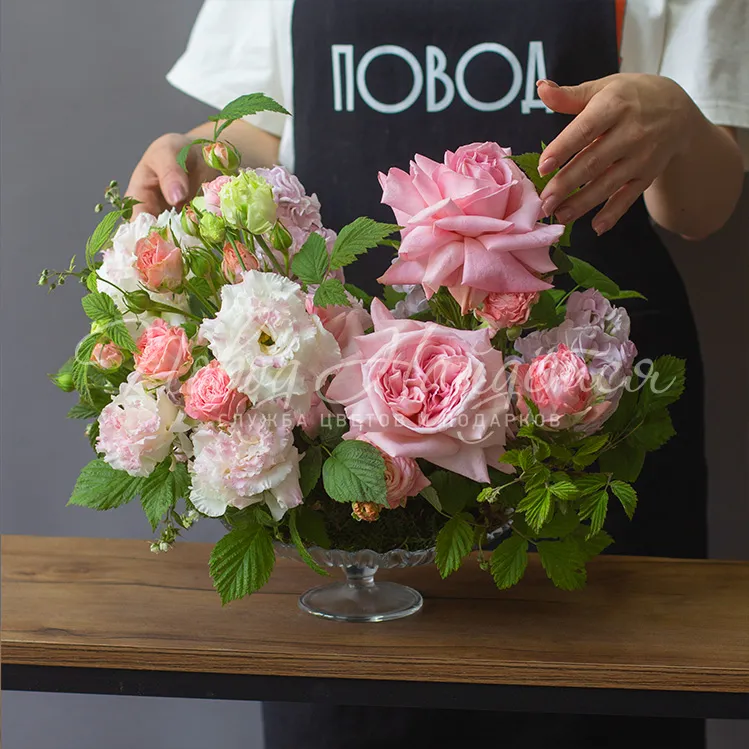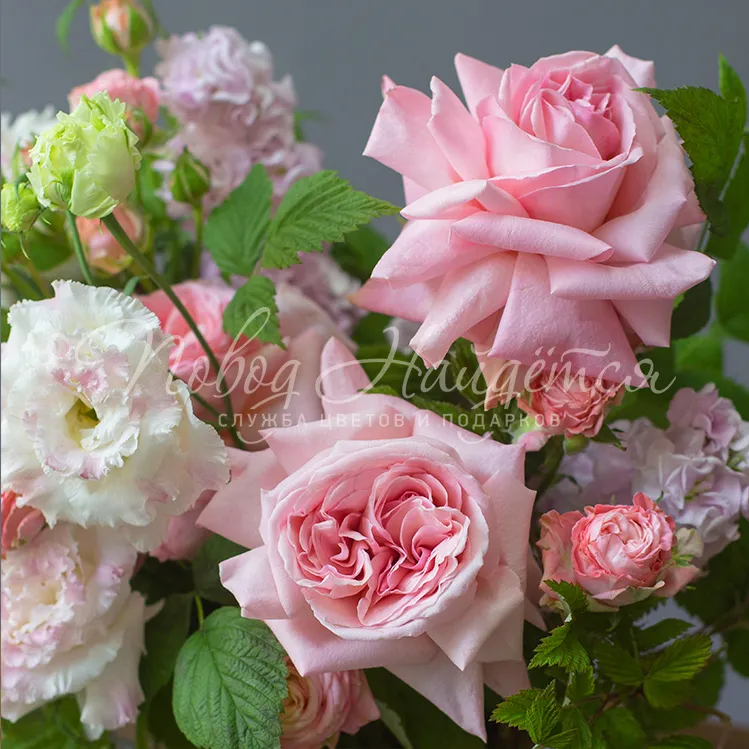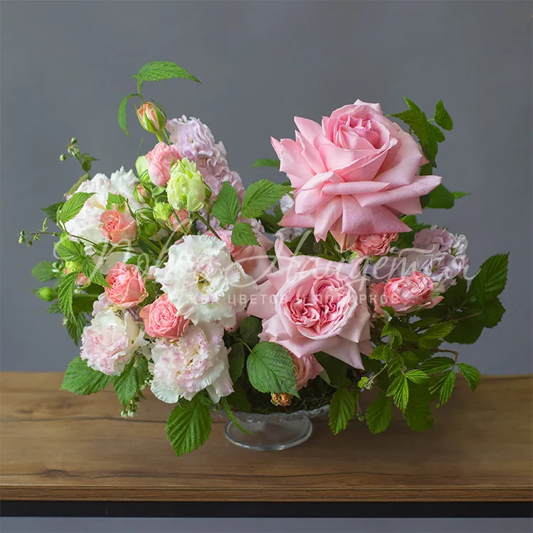 Состав: роза пинк охара 3 шт, маттиола розовая одноголовая 3 шт, эустома алиса розовая 3 шт, роза бомбастик 2 шт, малина зелень 0.2 шт, мох