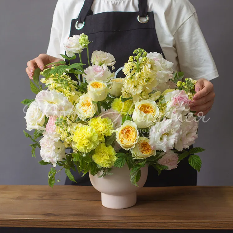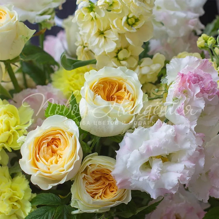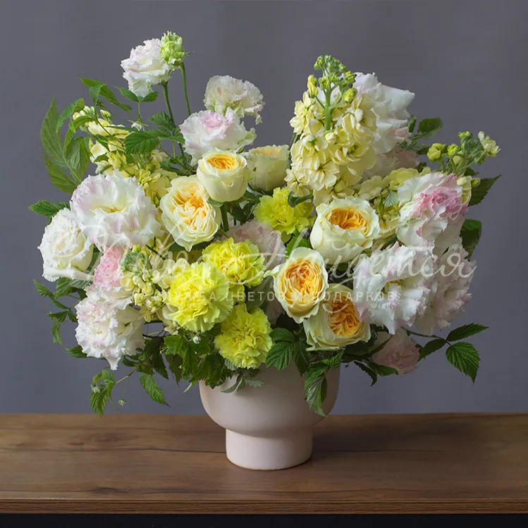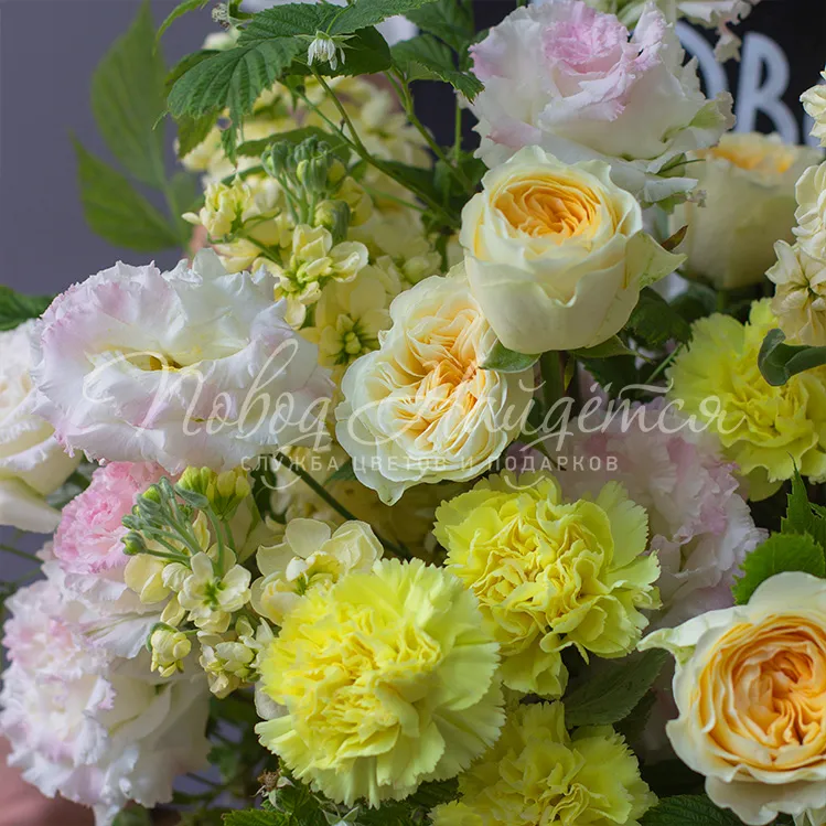 Состав: диантус желтый 8 шт, роза пионовидная вувузела 9 шт, маттиола желтая 7 шт, эустома алиса белая 6 шт, малина зелень 0.3